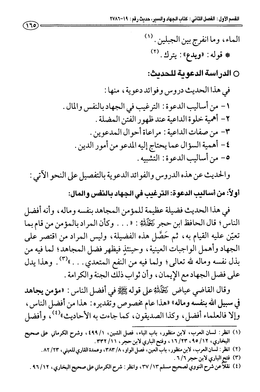 أولا: من أساليب الدعوة: الترغيب في الجهاد بالنفس والمال: في هذا الحديث فضيلة عظيمة للمؤمن المجاهد بنفسه وماله، وأنه أفضل الناس؛ قال الحافظ ابن حجر رحمه الله: ". . . وكأن المراد بالمؤمن من قام بما تعيّن عليه القيام به، ثم حَصَّل هذه الفضيلة، وليس المراد من اقتصر على الجهاد وأهمل الواجبات العينية، وحينئذٍ فيظهر فضل المجاهد؛ لما فيه من بذل نفسه وماله لله تعالى؛ ولما فيه من النفع المتعدي. . . " (¬3). وهذا يدل على فضل الجهاد مع الإِيمان، وأن ثواب ذلك الجنة والكرامة.