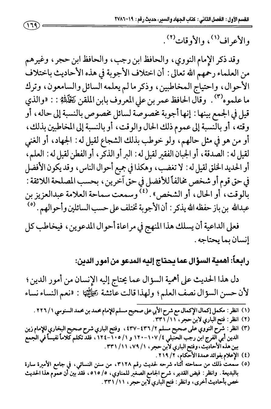 والأعراف (¬1) والأوقات (¬2) وقد ذكر الإمام النووي، والحافظ ابن رجب، والحافظ ابن حجر، وغيرهم من العلماء رحمهم الله تعالى: أن اختلاف الأجوبة في هذه الأحاديث باختلاف الأحوال، واحتياج المخاطبين، وذكر ما لم يعلمه السائل والسامعون، وترك ما علموه (¬3).