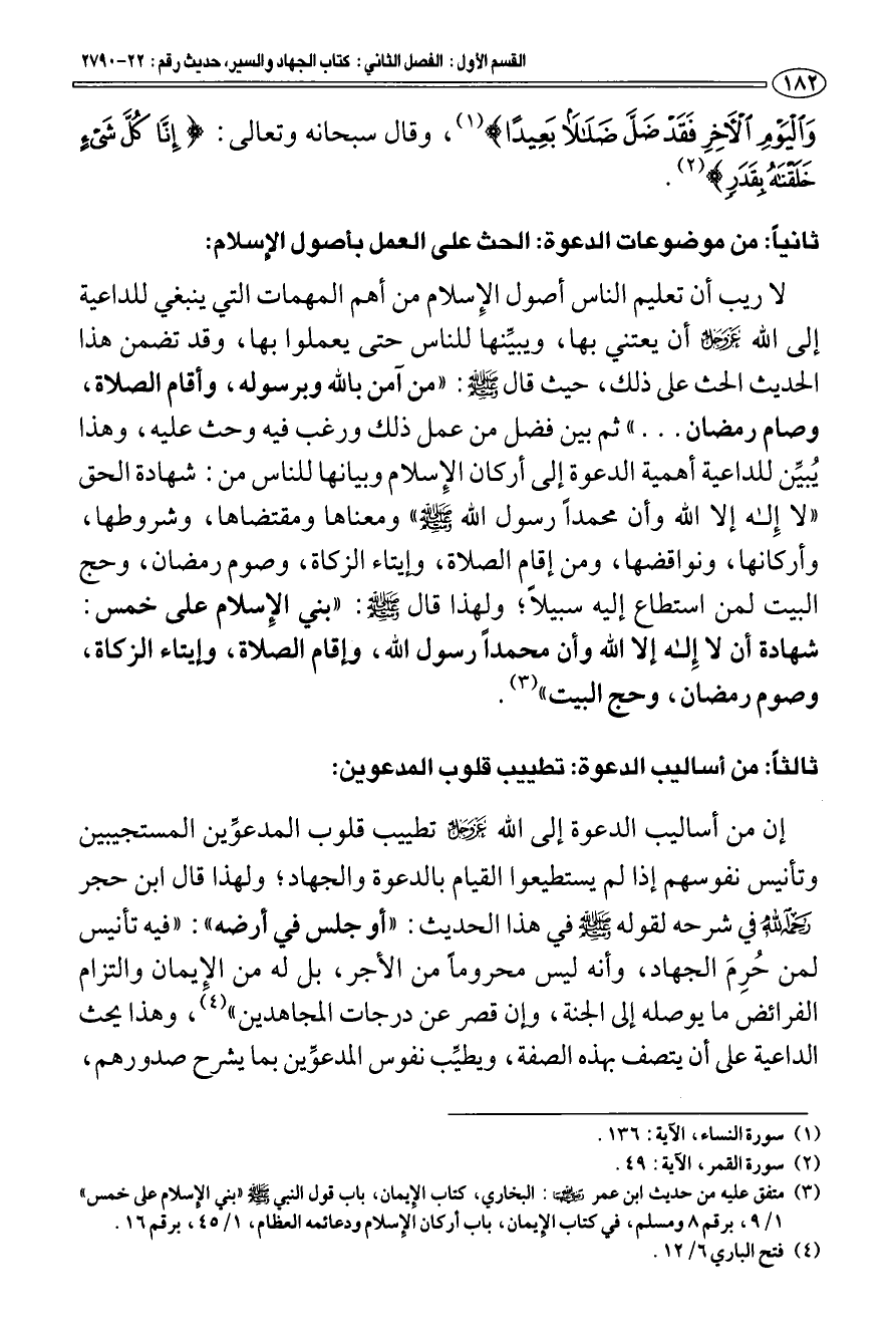 (¬2) متفق عليه من حديث ابن عمر رضي الله عنهما: البخاري، كتاب الإيمان، باب قول النبي صلى الله عليه وسلم " بني الإسلام على خمس " 1/ 9، برقم 8 ومسلم، في كتاب الإِيمان، باب أركان الإِسلام ودعائمه العظام، 1/ 45، برقم 16.
