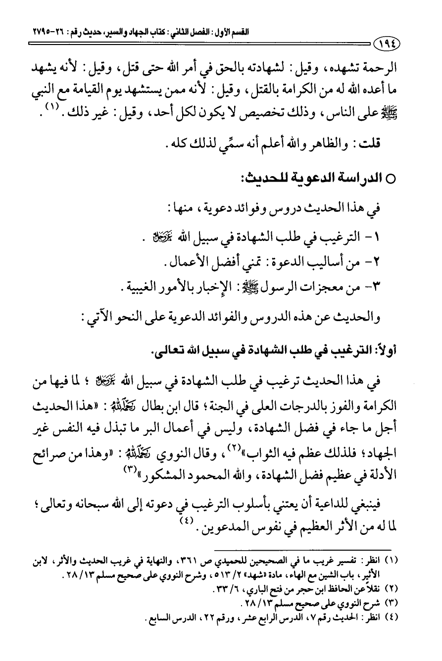 (¬1) انظر: تفسير غريب ما في الصحيحين للحميدي ص 361، والنهاية في غريب الحديث والأثر، لابن الأثير، باب الشين مع الهاء، مادة " شهد " 2/ 513، وشرح النووي على صحيح مسلم 13/ 28.