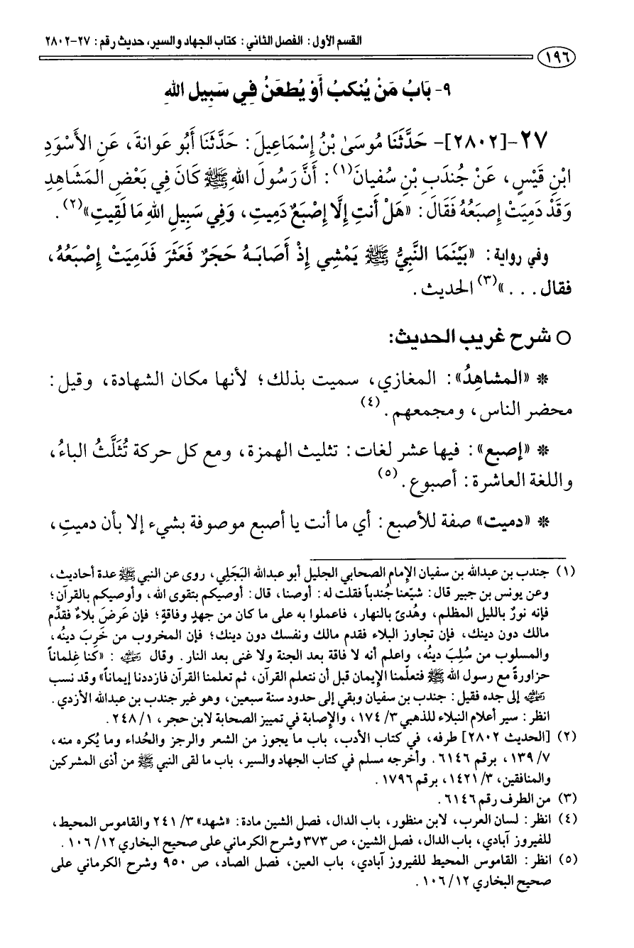 27 - [2802] حَدَّثَنَا موسَى بْن إِسْمَاعِيلَ: حَدَّثَنَا أَبو عَوانةَ، عَنِ الأَسْوَدِ بْنِ قَيْسٍ، عَنْ جندَب بْنِ سفيانَ (¬1) أَنَّ رَسولَ اللهِ - صلى الله عليه وسلم - كَانَ فِي بَعْضِ المَشَاهِدِ وَقَدْ دَمِيَتْ إِصبَعه فَقَالَ: «هَلْ أَنتِ إِلَّا إِصْبَع دَمِيتِ، وَفِي سَبِيلِ اللهِ مَا لَقيتِ» (¬2).