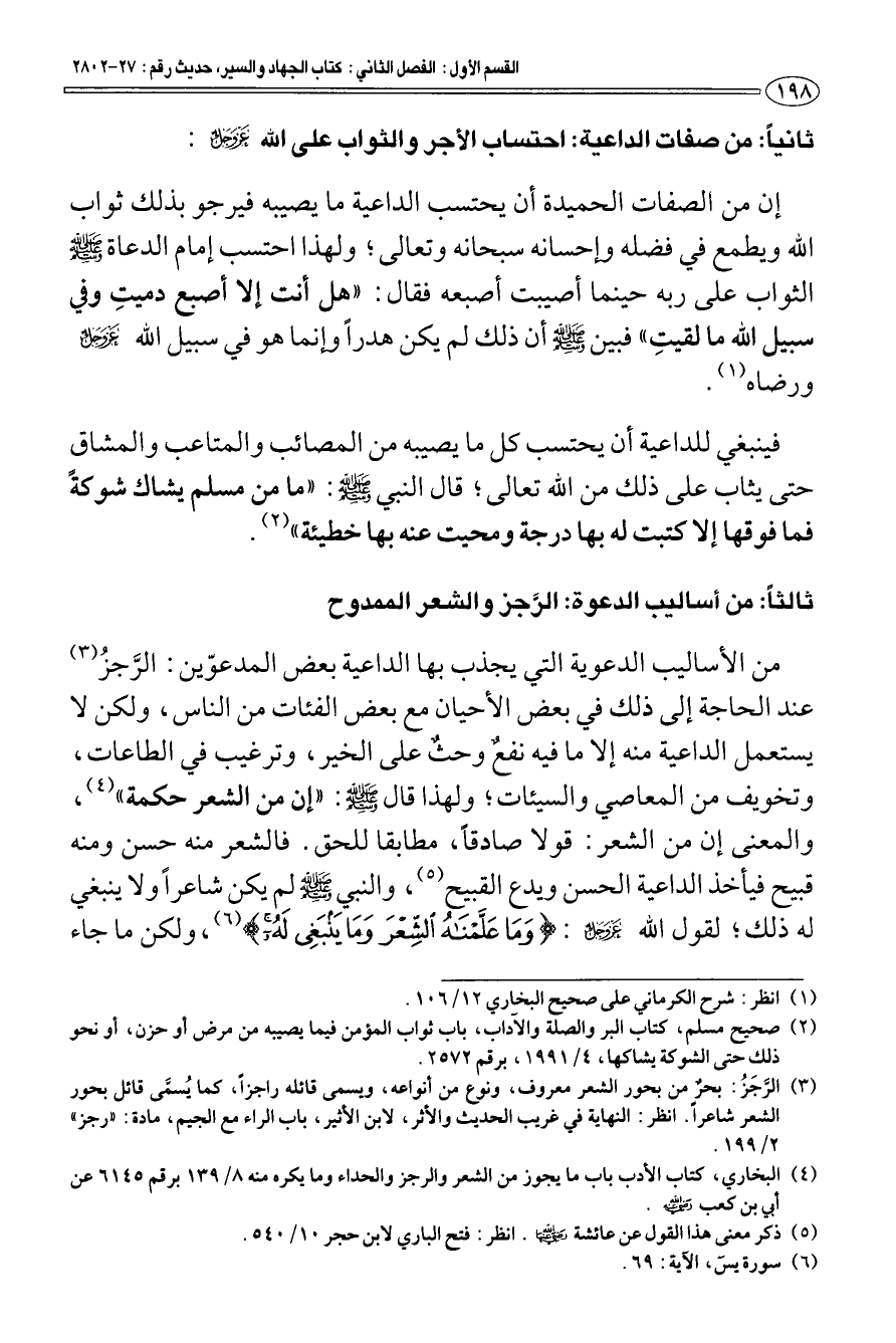 ثانيا: من صفات الداعية: احتساب الأجر والثواب على الله - عز وجل: إن من الصفات الحميدة أن يحتسب الداعية ما يصيبه فيرجو بذلك ثواب الله ويطمع في فضله وإحسانه سبحانه وتعالى؛ ولهذا احتسب إمام الدعاة - صلى الله عليه وسلم - الثواب على ربه حينما أصيبت أصبعه فقال: «هل أنت إلا أصبع دميتِ وفي سبيل الله ما لقيتِ» فبين - صلى الله عليه وسلم - أن ذلك لم يكن هدرا وإنما هو في سبيل الله - عز وجل - ورضاه (¬1).