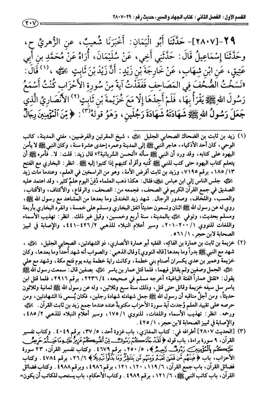 29 - [2807] حَدَّثَنَا أَبو الْيَمَانِ: أَخْبَرَنَا شعيب، عنِ الزهريِّ حِ، وحَدَثَنَا إِسْمَاعِيل قَالَ: حَدَّثَنِي أَخِي، عَنْ سلَيْمَانَ، أرَاه عَنْ محَمَّدِ بنِ أِبِي عَتِيقٍ، عَنِ ابْنِ شِهَابٍ، عَنْ خَارِجَةَ بْنِ زَيْدٍ: أَنَّ زَيْدَ بْنَ ثَابِتٍ، رضي الله عنه، (¬1). قَال: " نَسَخْت الصّحفَ فِي المَصَاحِفِ فَفَقَدْت آية مِنْ سورِةِ الأَحْزَابِ كنْت أَسْمَع رَسولَ اللهِ - صلى الله عليه وسلم - يقْرَأ بِهَا، فَلَمْ أَجِدْهَا إِلّا مَعَ خزَيْمةَ بْنِ ثَابتٍ (¬2). الأنصَارِيِّ الَّذِي جَعَلَ رَسول اللهِ - صلى الله عليه وسلم - شَهَادَتَه شَهَادَةَ رَجلَينِ، وَهَو قوله: (¬3)