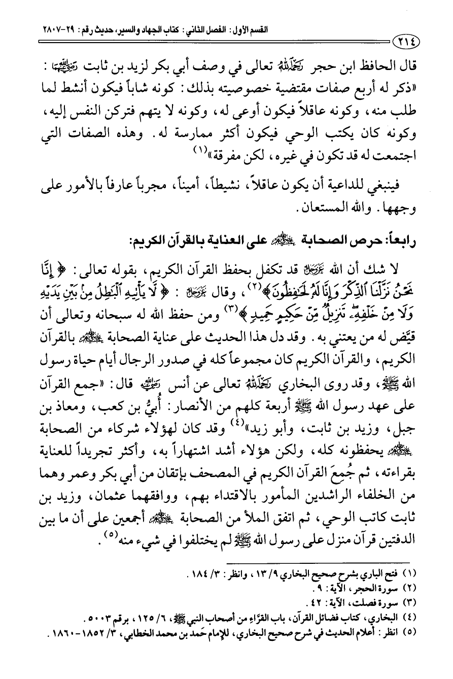 قال الحافظ ابن حجر -رحمه الله تعالى - في وصف أبي بكر لزيد بن ثابت رضي الله عنهما: " ذكر له أربع صفات مقتضية خصوصيته بذلك: كونه شابا فيكون أنشط لما طلب منه، وكونه عاقلا فيكون أوعى له، وكونه لا يتهم فتركن النفس إليه، وكونه كان يكتب الوحي فيكون أكثر ممارسة له. وهذه الصفات التي اجتمعت له قد تكون في غيره، لكن مفرقة " (¬1).