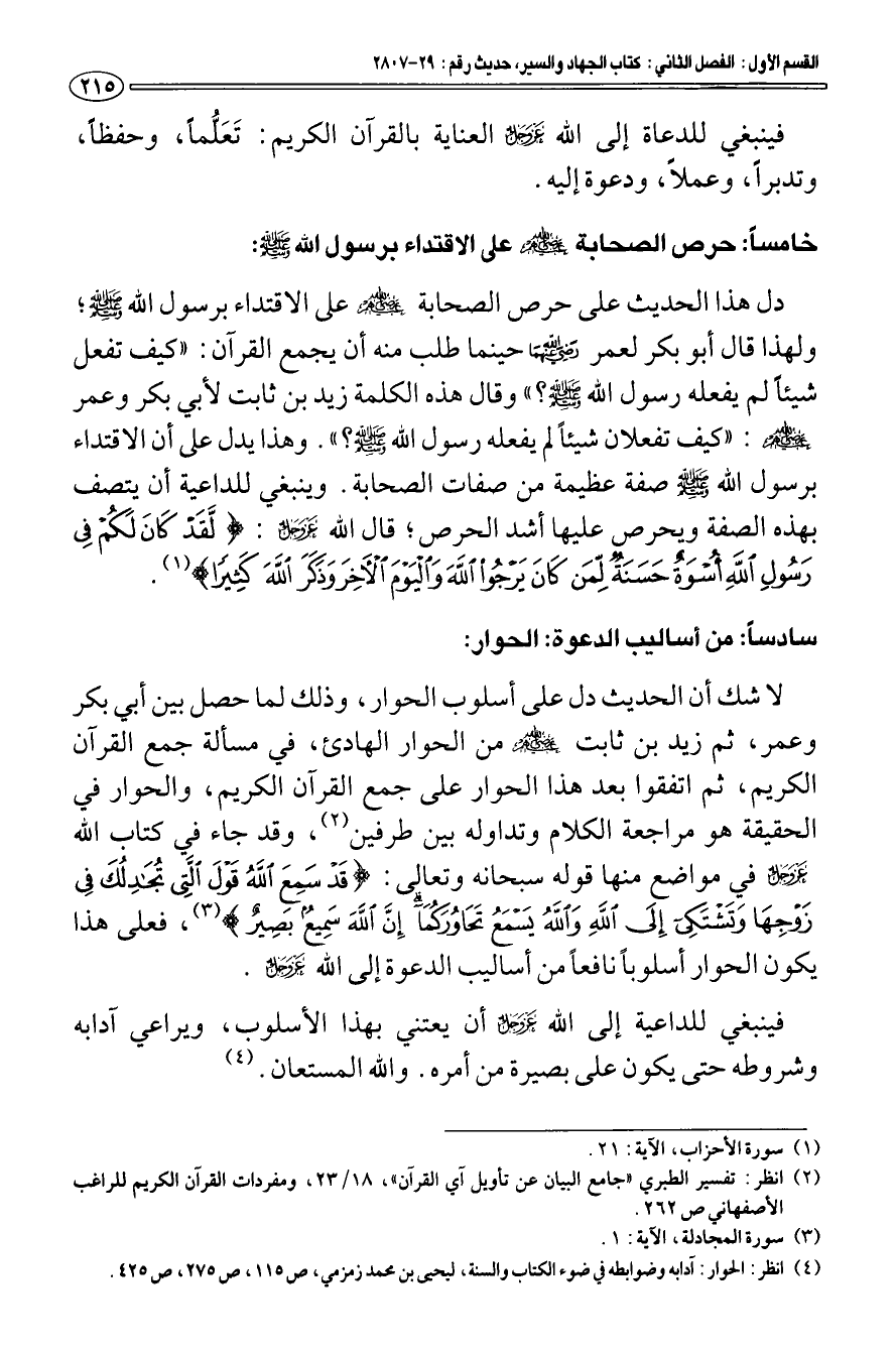 سادسا: من أساليب الدعوة: الحوار: لا شك أن الحديث دل على أسلوب الحوار، وذلك لما حصل بين أبي بكر وعمر، ثم زيد بن ثابت رضي الله عنهم من الحوار الهادئ، في مسألة جمع القرآن الكريم، ثم اتفقوا بعد هذا الحوار على جمع القرآن الكريم، والحوار في الحقيقة هو مراجعة الكلام وتداوله بين طرفين (¬2). وقد جاء في كتاب الله - عز وجل - في مواضع منها قو له سبحانه وتعالى: {قَدْ سَمِعَ اللَّهُ قَوْلَ الَّتِي تُجَادِلُكَ فِي زَوْجِهَا وَتَشْتَكِي إِلَى اللَّهِ وَاللَّهُ يَسْمَعُ تَحَاوُرَكُمَا إِنَّ اللَّهَ سَمِيعٌ بَصِيرٌ} [المجادلة: 1] (¬3) فعلى هذا يكون الحوار أسلوبا نافعا من أساليب الدعوة إلى الله عز وجل.