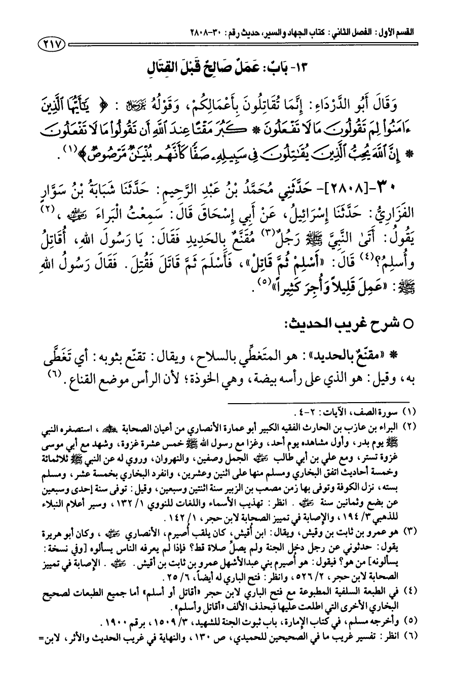 30 - [2808] حَدَّثَنِي محَمَّد بْن عَبْدِ الرَّحِيمِ: حَدَّثَنَا شَبَابَة بْن سَوَّارٍ الفَزَارِيّ: حَدَّثَنَا إِسْرَائِيل، عَنْ أَبِي إِسْحَاقَ قَالَ: سَمِعْت الْبَراءَ رضي الله عنه (¬2). يَقول: «أتى النَّبِيَّ - صلى الله عليه وسلم - رَجل (¬3). مقَنَّع بِالحَدِيدِ فَقَالَ: يَا رَسولَ اللهِ، أقَاتِل وأسلِم؟ (¬4). قَالَ: " أَسْلِمْ ثمَّ قَاتِلْ "، فَأَسْلَمَ ثَمَّ قَاتَلَ فَقتِلَ. فَقَالَ رَسول اللهِ - صلى الله عليه وسلم -: " عَمِلَ قَلِيلا وَأجِرَ كَثيرا» (¬5).
