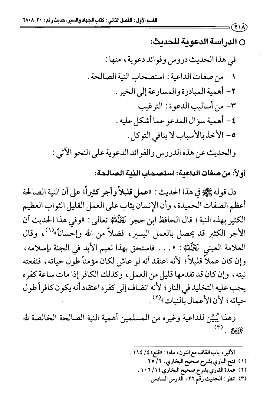 أولا: من صفات الداعية: استصحاب النية الصالحة: دل قوله - صلى الله عليه وسلم - في هذا الحديث: " عمل قليلا وأجر كثيرا " على أن النية الصالحة أعظم الصفات الحميدة، وأن الإنسان يثاب على العمل القليل الثواب العظيم الكثير بهذه النية؛ قال الحافظ ابن حجر رحمه الله تعالى: " وفي هذا الحديث أن الأجر الكثير قد يحصل بالعمل اليسير، فضلا من الله وإحسانا " (¬1). وقال العلامة العيني رحمه الله: ". . . فاستحق بهذا نعيم الأبد في الجنة بإسلامه، وإن كان عملا قليلا؛ لأنه اعتقد أنه لو عاش لكان مؤمنا طول حياته، فنفعته نيته، وإن كان قد تقدمها قليل من العمل، وكذلك الكافر إذا مات ساعة كفره يجب عليه التخليد في النار؛ لأنه انضاف إلى كفره اعتقاد أنه يكون كافرا طول حياته؛ لأن الأعمال بالنيات " (¬2).