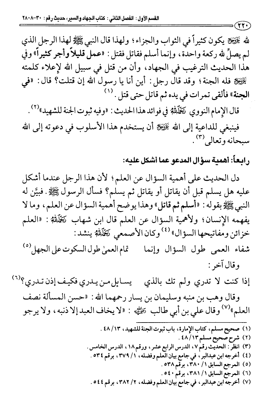 رابعا: أهمية سؤال المدعو عما أشكل عليه: دل الحديث على أهمية السؤال عن العلم؛ لأن هذا الرجل عندما أشكل عليه هل يسلم قبل أن يقاتل أو يقاتل ثم يسلم؟ فسأل الرسول - صلى الله عليه وسلم - فبيَّن له النبي - صلى الله عليه وسلم - بقوله: «أسلم ثم قاتل» وهذا يوضح أهمية السؤال عن العلم، وما لا يفهمه الإِنسان؛ ولأهمية السؤال عن العلم قال ابن شهاب رحمه الله: " العلم خزائن ومفاتيحها السؤال " (¬4). وكان الأصمعي رحمه الله ينشد: