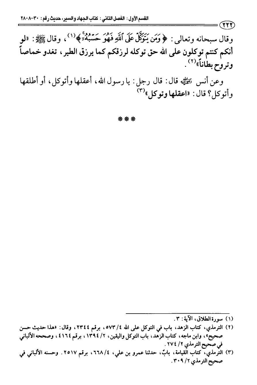 (¬2) الترمذي، كتاب الزهد، باب في التوكل على الله 4/ 573، برقم 2344، وقال: " هذا حديث حسن صحيح "، وابن ماجه، كتاب الزهد، باب التوكل واليقين، 2/ 1394، برقم 4164، وصححه الألباني في صحيح الترمذي 2/ 274.
