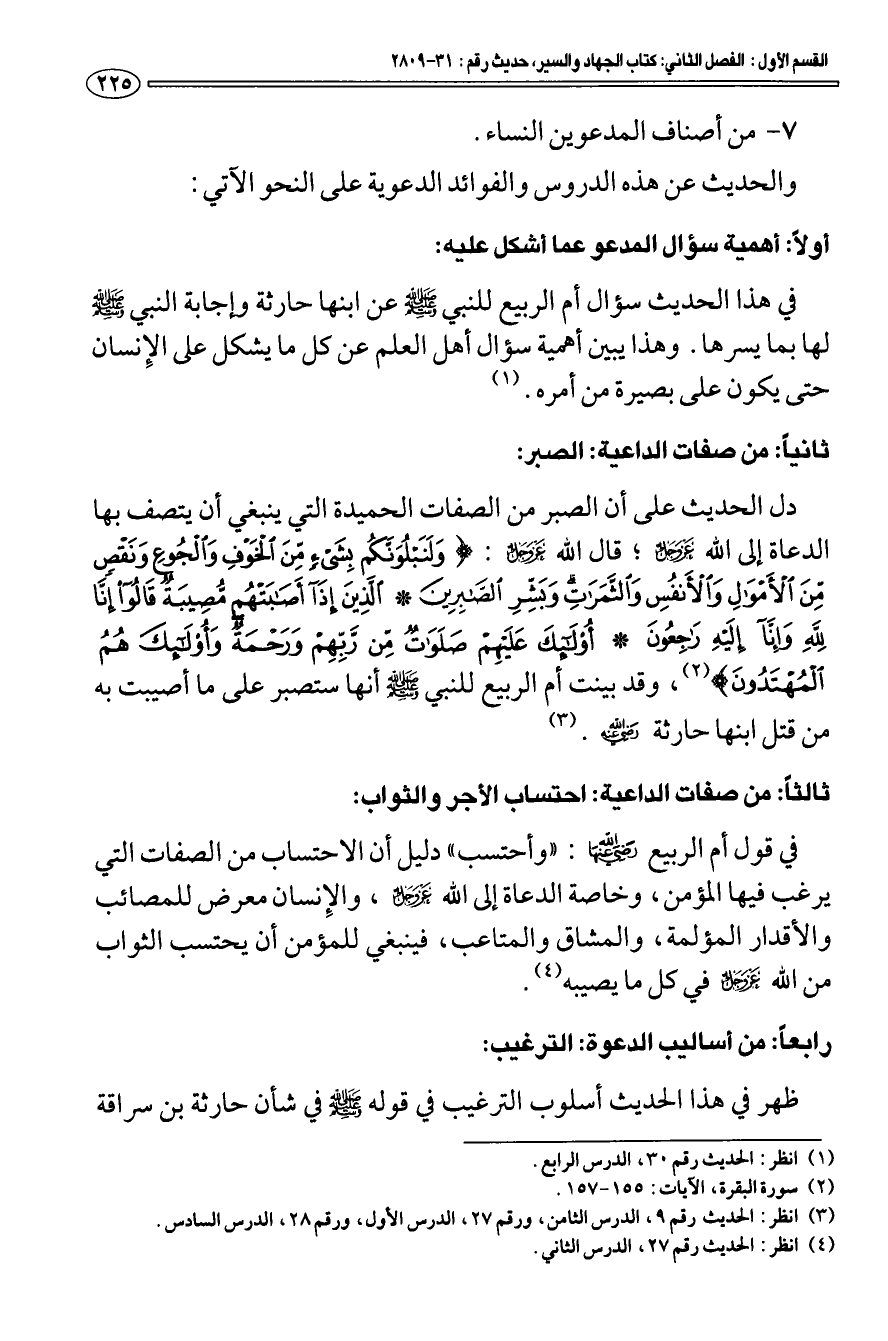 أولا: أهمية سؤال المدعو عما أشكل عليه: في هذا الحديث سؤال أم الربيع للنبي - صلى الله عليه وسلم - عن ابنها حارثة وإجابة النبي - صلى الله عليه وسلم - لها بما يسرها. وهذا يبين أهمية سؤال أهل العلم عن كل ما يشكل على الإِنسان حتى يكون على بصيرة من أمره (¬1).