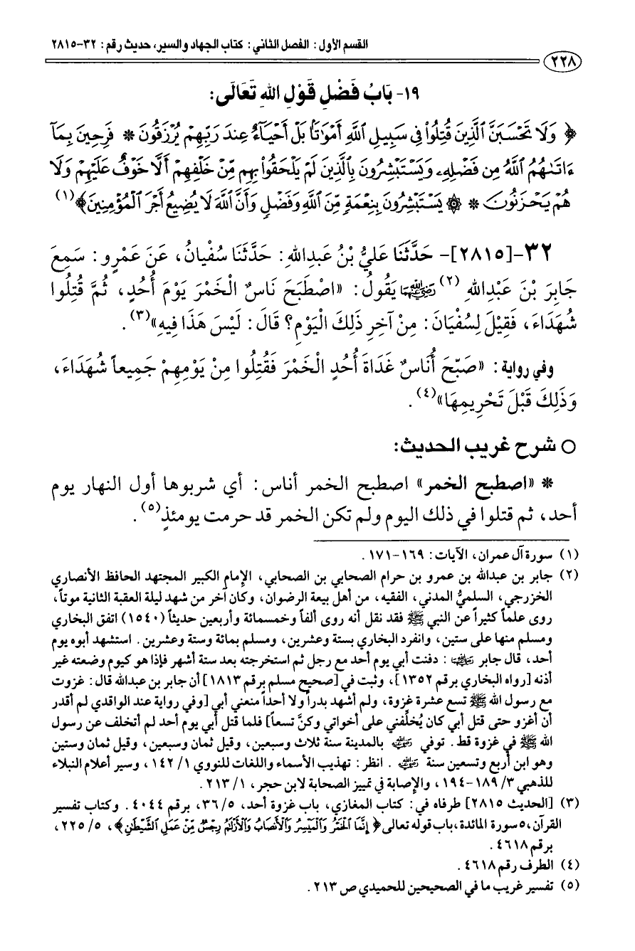 32 - [2815] حَدَّثَنَا عَليّ بْن عَبدِ اللهِ: حَدَّثَنَا سفْيان، عَنَ عَمْرٍو: سَمِعَ جَابِرَ بْنَ عَبْدِ اللهِ (¬2) رضي الله عنه يَقول: " اصْطَبَحَ نَاس الْخَمْرَ يَوْمَ أحدٍ، ثمَّ قتِلوا شهَدَاءَ، فَقيْلَ لِسفْيَانَ: مِنْ آخِرِ ذَلِكَ الْيَوْمِ؟ قَالَ: لَيْسَ هَذَا فِيهِ " (¬3).