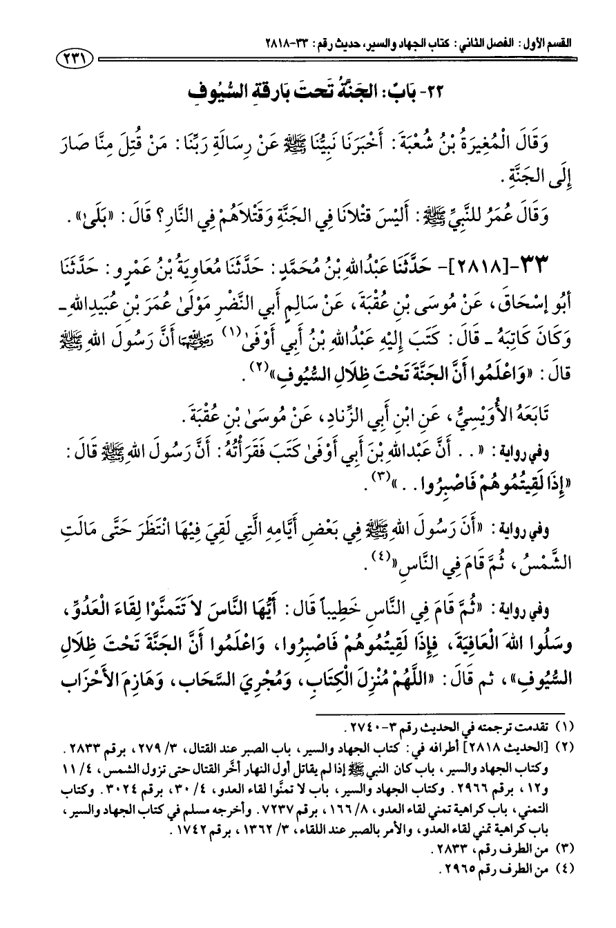 33 - [2818] حَدَّثَنَا عَبْد اللهِ بن محَمَّدٍ: حَدَّثَنَا معَاوِيَة بْن عَمْرو: حَدَّثَنَا أبو إسْحَاقَ، عَنْ موسَى بْنِ عقْبَةَ، عَنْ سَالِمٍ أَبي النَّضْرِ مَوْلَى عمَرَ بْنِ عبَيدِ اللهِ - وَكَانَ كَاتِبَه - قَالَ: كَتَبَ إِليْهِ عَبْد اللهِ بْن أَبِي أَوفَى (¬1) رضي الله عنهما أَنَّ رَسولَ اللهِ - صلى الله عليه وسلم - قالَ: «وَاعْلَموا أَنَّ الجَنَّةَ تَحْتَ ظِلَالِ السّيوفِ» (¬2).