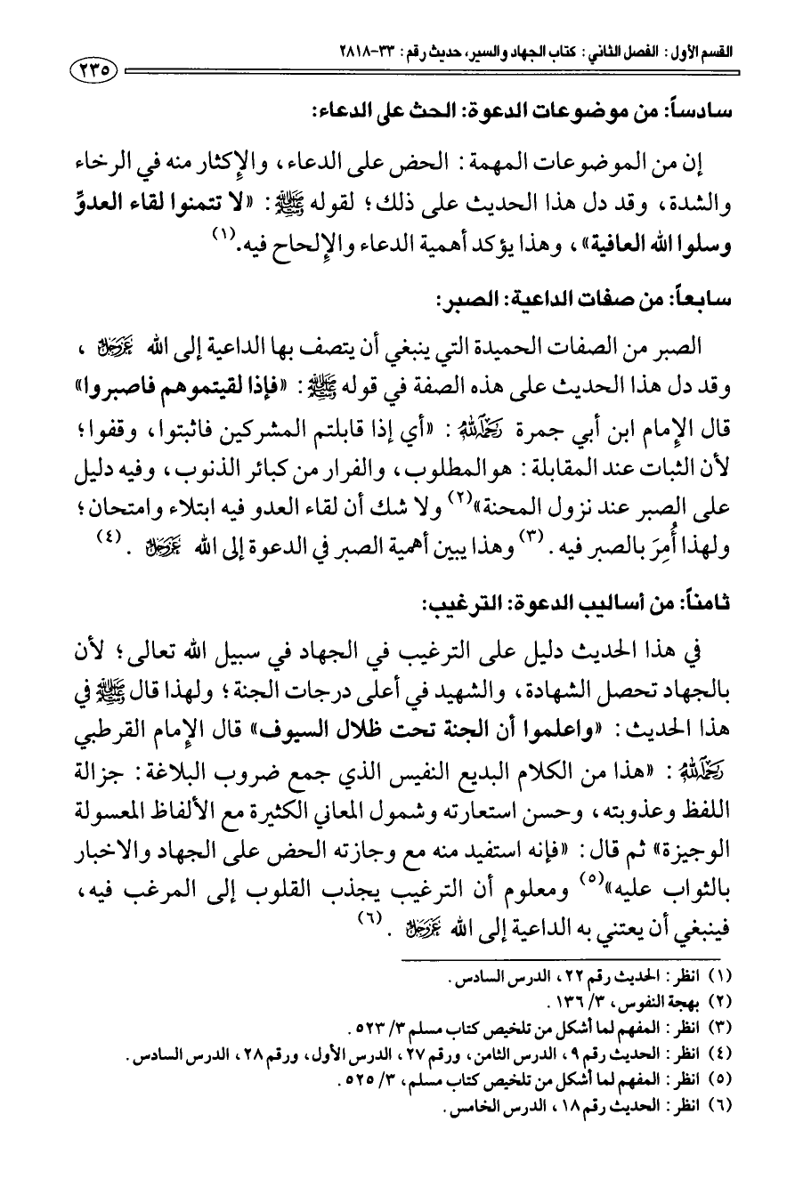 سابعا: من صفات الداعية: الصبر: الصبر من الصفات الحميدة التي ينبغي أن يتصف بها الداعية إلى الله، عز وجل، وقد دل هذا الحديث على هذه الصفة في قوله - صلى الله عليه وسلم -: «فإذا لقيتموهم فاصبروا» قال الإمام ابن أبي جمرة - رحمه الله: " أي إذا قابلتم المشركين فاثبتوا، وقفوا؛ لأن الثبات عند المقابلة: هو المطلوب، والفرار من كبائر الذنوب، وفيه دليل على الصبر عند نزول المحنة " (¬2) ولا شك أن لقاء العدو فيه ابتلاء وامتحان؛ ولهذا أمِرَ بالصبر فيه (¬3). وهذا يبين أهمية الصبر في الدعوة إلى الله عز وجل (¬4).