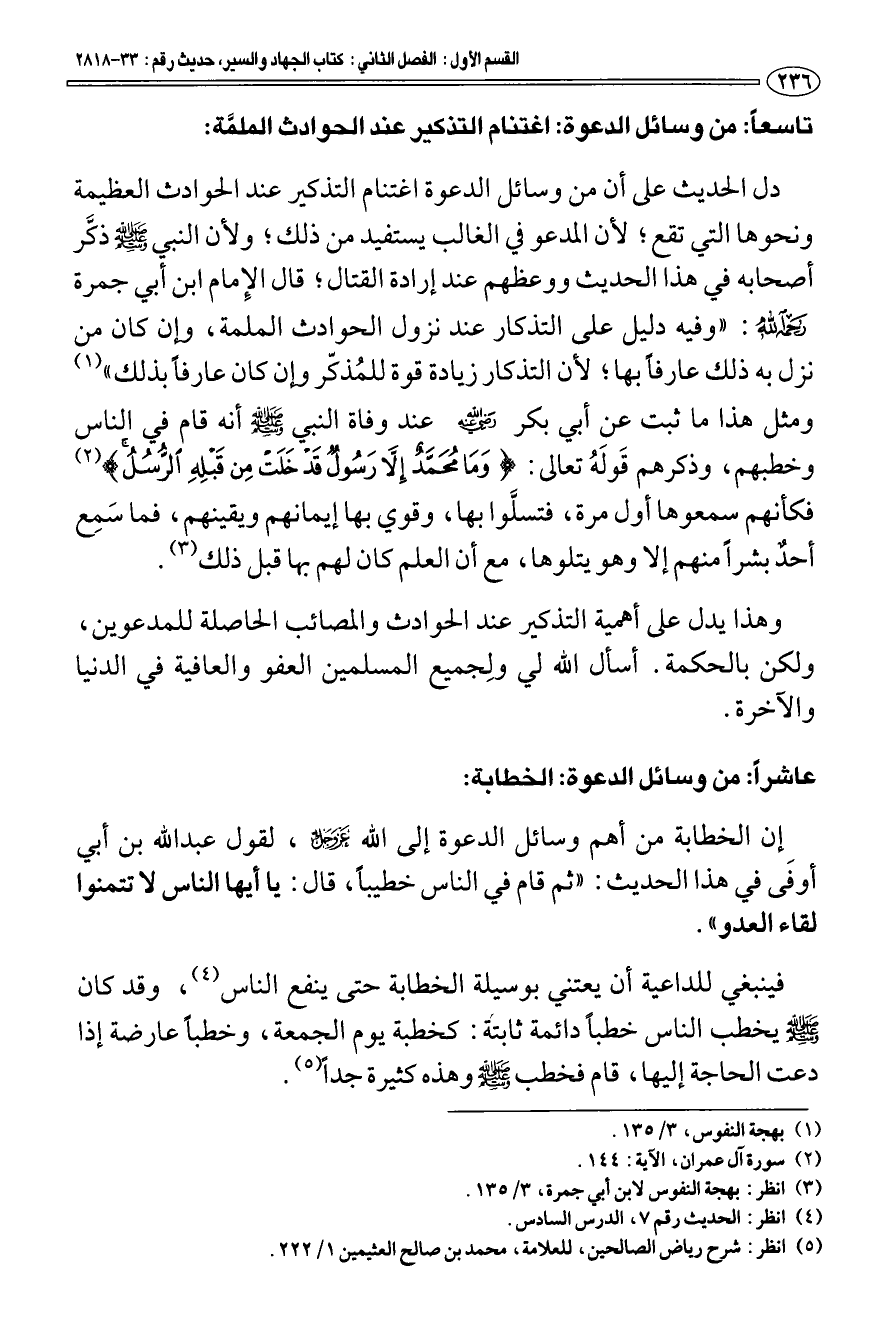 تاسعا: من وسائل الدعوة: اغتنام التذكير عند الحوادث الملمة: دل الحديث على أن من وسائل الدعوة اغتنام التذكير عند الحوادث العظيمة ونحوها التي تقع؛ لأن المدعو في الغالب يستفيد من ذلك؛ ولأن النبي - صلى الله عليه وسلم - ذكَّر أصحابه في هذا الحديث ووعظهم عند إرادة القتال؛ قال الإمام ابن أبي جمرة رحمه الله: " وفيه دليل على التذكار عند نزول الحوادث الملمة، وإن كان من نزل به ذلك عارفا بها؛ لأن التذكار زيادة قوة للمذكّر وإن كان عارفا بذلك " (¬1).