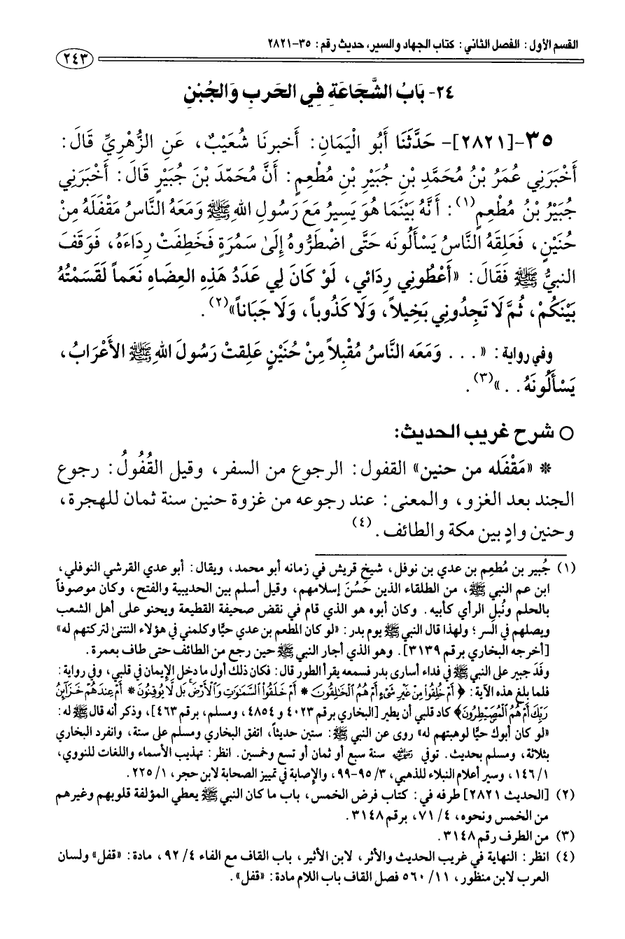 35 - [2821] حَدَّثَنَا أَبو الْيَمَانِ: أَخبرنَا شعَيْب، عَنِ الزّهْرِيِّ قَالَ: أَخْبَرَنِي عمَر بْن محَمَّدِ بْنِ جبَيْرِ بْنِ مطْعِمٍ: أَنَّ محَمّدَ بْنَ جبَيْرٍ قَالَ: أَخْبَرَنِي جبير بن مطعم (¬1) أَنَّه بَيْنَمَا هوَ يَسير مَعَ رسول الله - صلى الله عليه وسلم - ومَعَه النَّاس مَقْفَلَه مِنْ حنَيْنٍ، فَعَلِقَه النَّاس يَسْألونَه حَتَّى اضْطَرّوه إِلَى سَمرَةٍ فخَطِفتْ رِدَاءَه، فوَقف النبي - صلى الله عليه وسلم - فقَالَ: «أَعطوني رِدَائي، لَوْ كَانَ لي عَدَد هَذِهِ العِضَاهِ نَعَما لَقَسَمْته بينَكمْ، ثمَّ لَا تَجِدوني بَخِيلا، وَلا كَذوبا، وَلَا جَبَانا» (¬2).