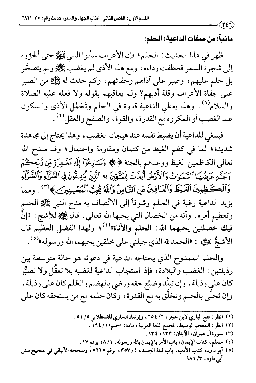 ثانيا: من صفات الداعية: الحلم: ظهر في هذا الحديث: الحلم؛ فإن الأعراب سألوا النبي - صلى الله عليه وسلم - حتى ألجؤوه إلى شجرة السمر فخطفت رداءه، ومع هذا الأذى لم يغضب - صلى الله عليه وسلم - ولم يتضجَّر بل حلم عليهم، وصبر على أذاهم وجفائهم، وكم حدث له - صلى الله عليه وسلم - من الصبر على جفاة الأعراب وقلة أدبهم؟ ولم يعاقبهم بقوله ولا فعله عليه الصلاة والسلام (¬1) وهذا يعطي الداعية قدوة في الحلم وتَحَمّل الأذى والسكون عند الغضب أو المكروه مع القدرة، والقوة، والصفح والعقل (¬2).