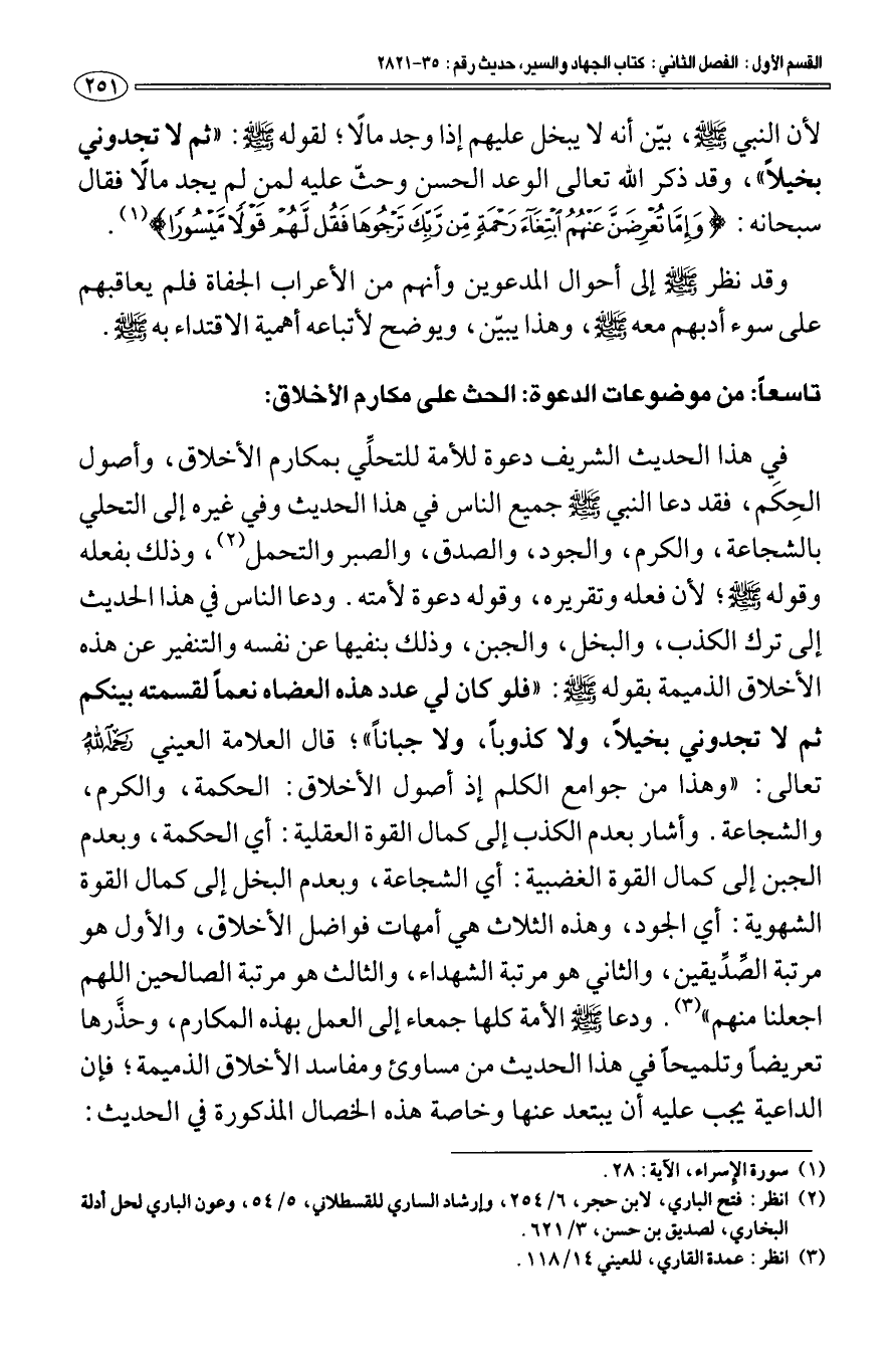 تاسعا: من موضوعات الدعوة: الحث على مكارم الأخلاق: في هذا الحديث الشريف دعوة للأمة للتحلِّي بمكارم الأخلاق، وأصول الحِكَم، فقد دعا النبي - صلى الله عليه وسلم - جميع الناس في هذا الحديث وفي غيره إلى التحلي بالشجاعة، والكرم، والجود، والصدق، والصبر والتحمل (¬1) وذلك بفعله وقوله - صلى الله عليه وسلم -؛ لأن فعله وتقريره، وقوله دعوة لأمته. ودعا الناس في هذا الحديث إلى ترك الكذب، والبخل، والجبن، وذلك بنفيها عن نفسه والتنفير عن هذه الأخلاق الذميمة بقوله - صلى الله عليه وسلم -: «فلو كان لي عدد هذه العضاه نعما لقسمته بينكم ثم لا تجدوني بخيلا، ولا كذوبا، ولا جبانا»؛ قال العلامة العيني، رحمه الله تعالى: " وهذا من جوامع الكلم إذ أصول الأخلاق: الحكمة، والكرم، والشجاعة. وأشار بعدم الكذب إلى كمال القوة العقلية: أي الحكمة، وبعدم الجبن إلى كمال القوة الغضبية: أي الشجاعة، وبعدم البخل إلى كمال القوة الشهوية: أي الجود، وهذه الثلاث هي أمهات فواضل الأخلاق، والأول هو مرتبة الصِّدِّيقين، والثاني هو مرتبة الشهداء، والثالث هو مرتبة الصالحين اللهم اجعلنا منهم " (¬2).
