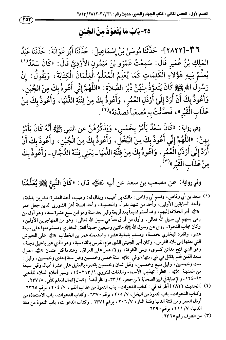 36 - [2822] حَدَّثَنَا موسَى بْن إِسْمَاعِيلَ: حَدَّثَنَا أَبو عَوَانَةَ: حَدَّثَنَا عَبْد المَلِكِ بْن عمَيرٍ قَالَ: سَمِعْت عَمْرَو بْنَ مَيمونٍ الأَوْدِيَّ قَالَ: " كَانَ سَعْد (¬1) يعلِّم بَنِيهِ هَؤلاءِ الْكَلِمَاتِ كَمَا يعَلِّم الْمعَلم الْغِلْمَانَ الْكِتَابةَ، وَيَقول: إِنَّ رَسولَ اللهِ - صلى الله عليه وسلم - كَانَ يَتَعوَّذ مِنْهنَّ دبرَ الصَّلاَةِ: «اللَّهمَّ إِنِّي أَعوذ بِكَ مِنَ الجبْنِ، وَأَعوذ بِكَ أَنْ أرَدَّ إِلَى أَرْذَلِ العمرِ، وَأَعوذ بكَ مِنْ فِتْنَةِ الدّنْيَا، وَأَعوذ بِكَ مِنْ عَذَابِ الْقَبْرِ»، فَحدَّثْت بِهِ مصعَبا فصدَّقه " (¬2).
