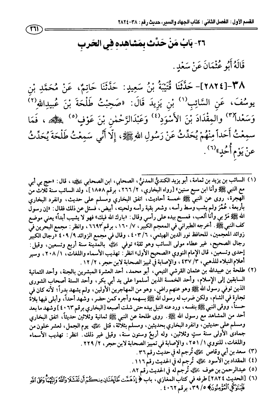 38 - [2824] حَدَّثَنَا قتَيْبَة بْن سَعِيد: حَدَّثَنَا حَاتِم، عَنْ محَمَّدِ بْنِ يوسفَ، عَنِ السَّائِبِ (¬1). بْنِ يَزِيدَ قَالَ: " صَحِبْت طَلْحَةَ بْنَ عبيدِ اللهِ (¬2). وَسَعْدا لم (¬3). والمِقْدَادَ بْنَ الأَسْوَدِ (¬4). وَعَبْدَ الرَّحْمنِ بْنَ عَوْفٍ (¬5). رضي الله عنهم، فَمَا سمِعْت أَحَدا مِنْهمْ يحَدِّث عَنْ رَسولِ اللهِ - صلى الله عليه وسلم -، إِلّا أني سَمِعْت طَلْحَةَ يحَدِّث عنْ يَومِ أحدٍ " (¬6).