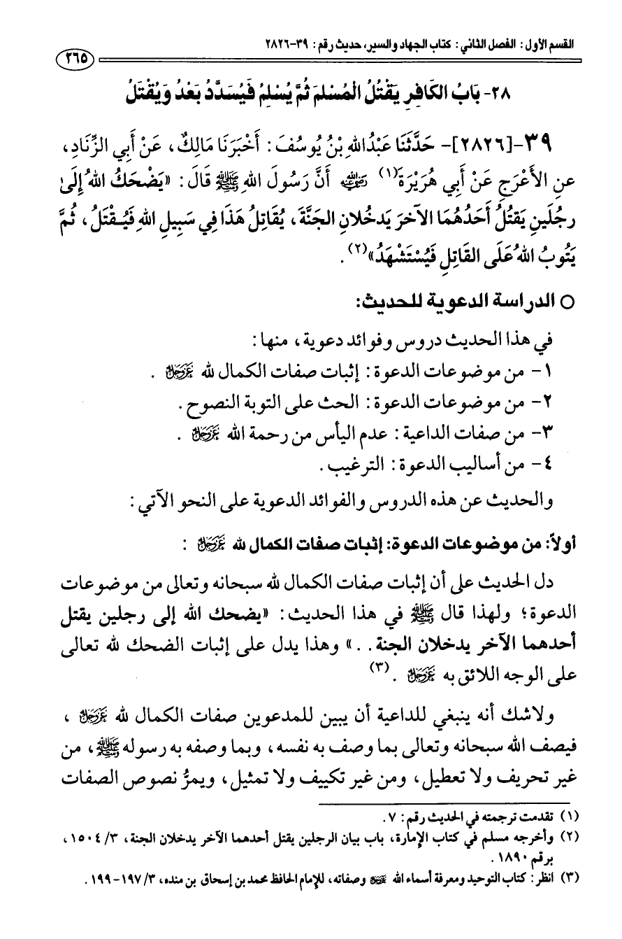 39 - [2826] حَدَّثَنَا عَبْد اللهِ بْن يوسفَ: أَخْبَرَنَا مَالِك، عَنْ أَبِي الزِّنَادِ، عنِ الأَعْرَجِ عَنْ أَبِي هرَيْرَةَ (¬1). رضي الله عنه أَنَّ رَسولَ اللهِ - صلى الله عليه وسلم - قالَ: «يَضْحَك الله إِلى رجلَينِ يَقتل أَحَدهمَا الآخرَ يَدخلانِ الجَنَّةَ، يقَاتِل هَذَا فِي سَبِيلِ اللهِ فيقْتَل، ثم يَتوب الله عَلَى القَاتِلِ فَيسْتَشْهَد» (¬2).