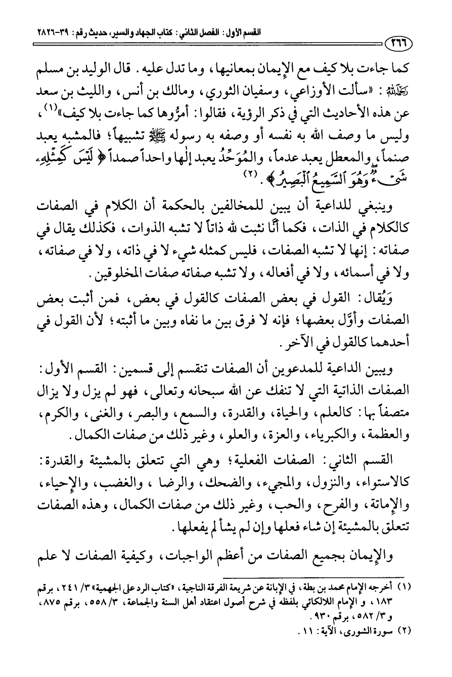 كما جاءت بلا كيف مع الإِيمان بمعانيها، وما تدل عليه. قال الوليد بن مسلم رحمة الله: " سألت الأوزاعي، وسفيان الثوري، ومالك بن أنس، والليث بن سعد عن هذه الأحاديث التي في ذكر الرؤية، فقالوا: أمرّوها كما جاءت بلا كيف " (¬1) وليس ما وصف الله به نفسه أو وصفه به رسوله - صلى الله عليه وسلم - تشبيها؛ فالمشبه يعبد صنما والمعطل يعبد عدما، والموَحِّد يعبد إلها واحدا صمدا {لَيْسَ كَمِثْلِهِ شَيْءٌ وَهُوَ السَّمِيعُ الْبَصِيرُ} [الشورى: 11] (¬2).