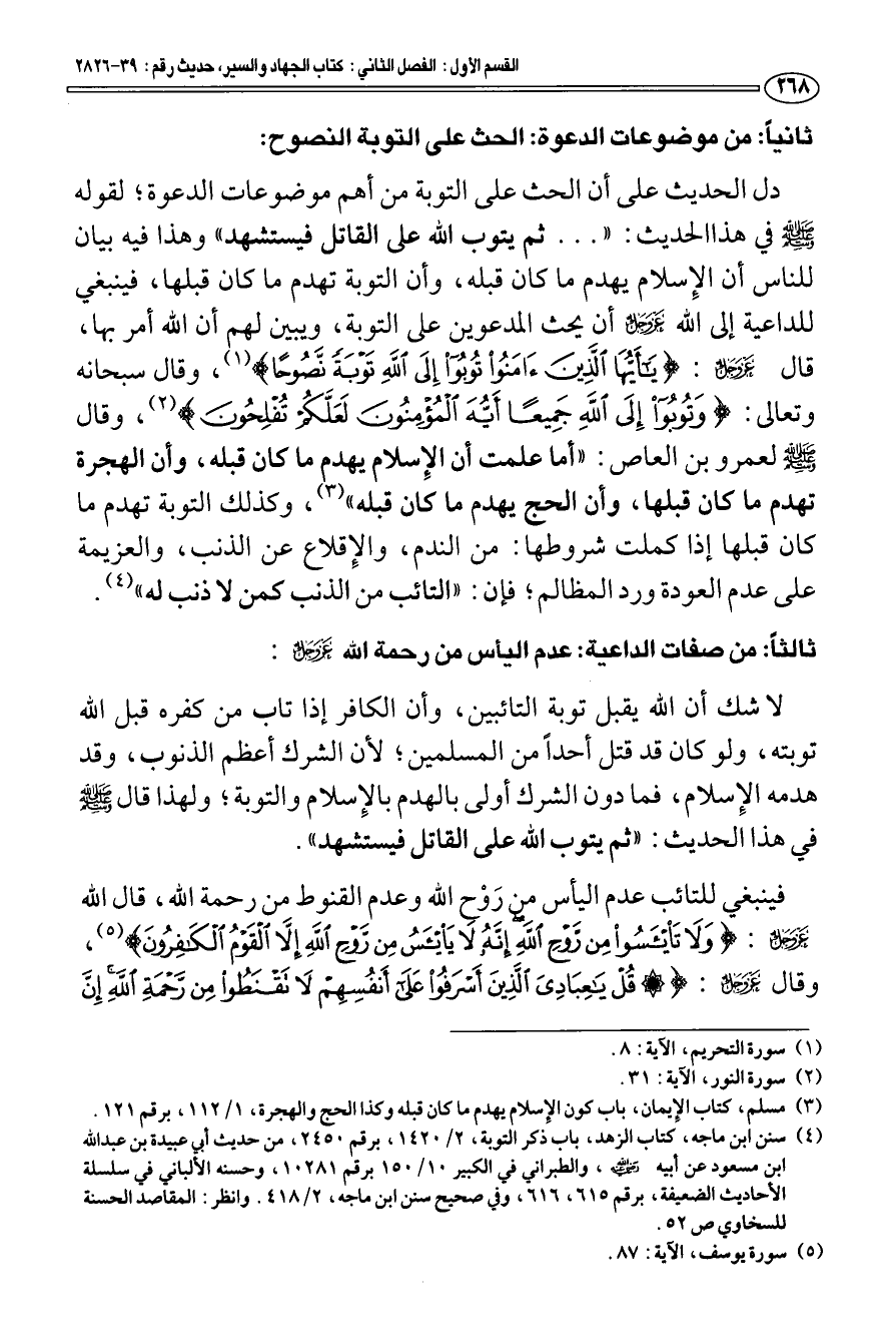 ثانيا: من موضوعات الدعوة: الحث على التوبة النصوح: دل الحديث على أن الحث على التوبة من أهم موضوعات الدعوة؛ لقوله - صلى الله عليه وسلم - في هذا الحديث: ". . . «ثم يتوب الله على القاتل فيستشهد» وهذا فيه بيان للناس أن الإِسلام يهدم ما كان قبله، وأن التوبة تهدم ما كان قبلها، فينبغي للداعية إلى الله عز وجل أن يحث المدعوين على التوبة، ويبين لهم أن الله أمر بها، قال عز وجل: {يَا أَيُّهَا الَّذِينَ آمَنُوا تُوبُوا إِلَى اللَّهِ تَوْبَةً نَصُوحًا} [التحريم: 8] (¬1) وقال سبحانه وتعالى: {وَتُوبُوا إِلَى اللَّهِ جَمِيعًا أَيُّهَ الْمُؤْمِنُونَ لَعَلَّكُمْ تُفْلِحُونَ} [النور: 31] (¬2) وقال - صلى الله عليه وسلم - لعمرو بن العاص: " أما علمت أن الإِسلام يهدم ما كان قبله، وأن الهجرة تهدم ما كان قبلها، وأن الحج يهدم ما كان قبله " (¬3) وكذلك التوبة تهدم ما كان قبلها إذا كملت شروطها: من الندم، والإِقلاع عن الذنب، والعزيمة على عدم العودة ورد المظالم؛ فإن: " التائب من الذنب كمن لا ذنب له " (¬4).