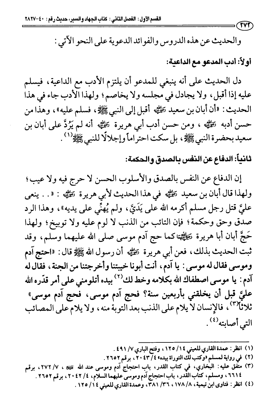 ثانيا: الدفاع عن النفس بالصدق والحكمة: إن الدفاع عن النفس بالصدق والأسلوب الحسن لا حرج فيه ولا عيب؛ ولهذا قال أبان بن سعيد في هذا الحديث لأبي هريرة رضي الله عنه: ". . ينعى عليَّ قتل رجل مسلم أكرمه الله على يَدَيَّ، ولم يهنِّي على يديه "، وهذا الرد صدق وحق وحكمة؛ فإن التائب من الذنب لا لوم عليه ولا توبيخ؛ ولهذا حَجَّ أبان أبا هريرة رضي الله عنه كما حج آدم موسى صلى الله عليهما وسلم، وقد ثبت الحديث بذلك، فعن أبي هريرة رضي الله عنه أن رسول الله - صلى الله عليه وسلم - قال: «احتج آدم وموسى فقال له موسى: يا آدم، أنت أبونا خيبتنا وأخرجتنا من الجنة، فقال له آدم: يا موسى اصطفاك الله بكلامه وخط لك (¬2) بيده أتلومني على أمر قدّره الله علي قبل أن يخلقني بأربعين سنة؛ فحج آدم موسى، فحج آدم موسى» ثلاثا (¬3) فالإِنسان لا يلام على الذنب بعد التوبة منه، ولا يلام على المصائب التي أصابته (¬4).