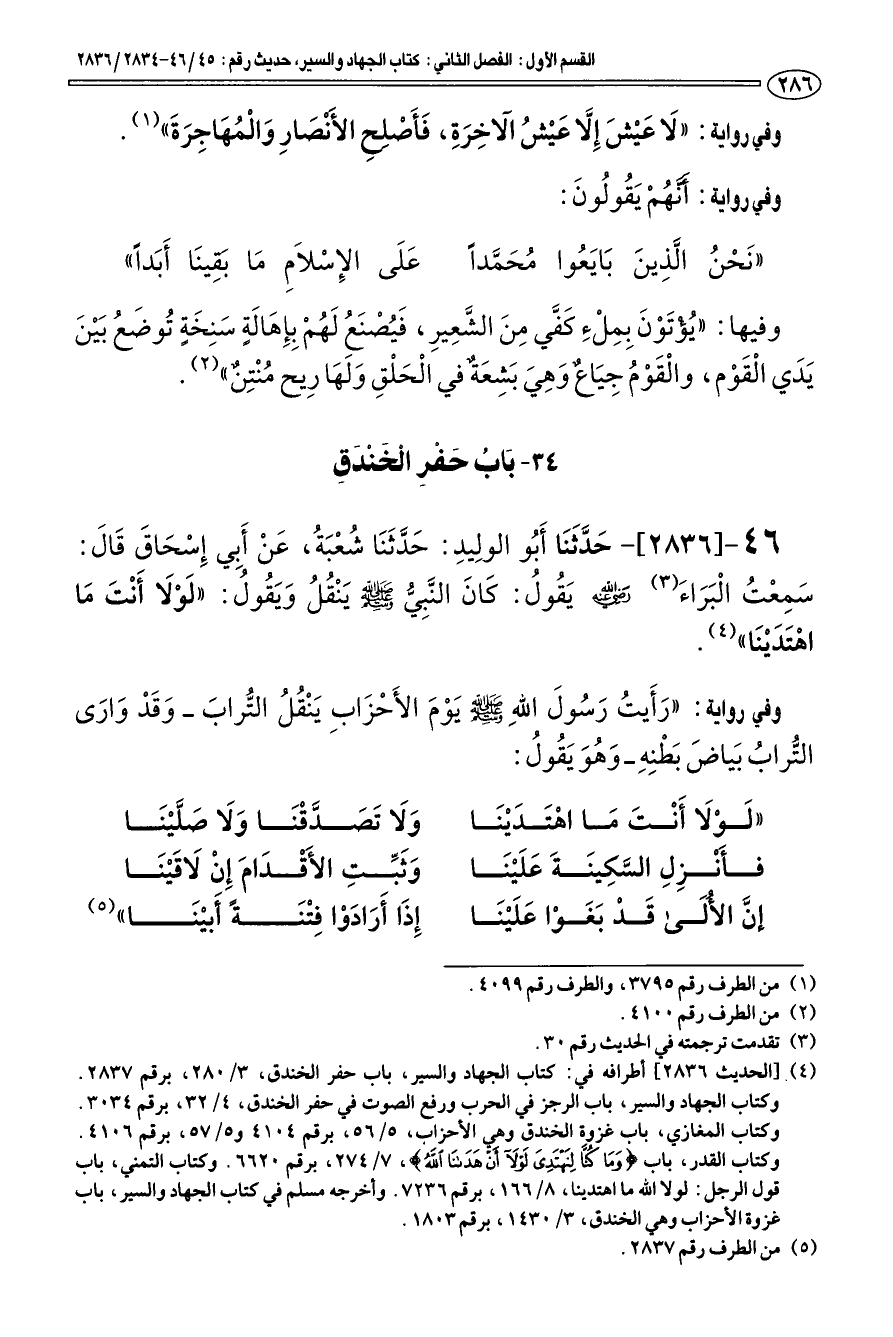 (¬4) [الحديث 2836] أطرافه في: كتاب الجهاد والسير، باب حفر الخندق، 3/ 280، برقم 2837. وكتاب الجهاد والسير، باب الرجز في الحرب ورفع الصوت في حفر الخندق، 4/ 32، برقم 3034. وكتاب المغازي، باب غزوة الخندق وهي الأحزاب، 5/ 56، برقم 4104 و 5/ 57، برقم 4106. وكتاب القدر، باب وما كنا لنهتدي لولا أن هدانا الله، 7/ 274، برقم 6620. وكتاب التمني، باب قول الرجل: لولا الله ما اهتدينا، 8/ 166، برقم 7236. وأخرجه مسلم في كتاب الجهاد والسير، باب غزوة الأحزاب وهي الخندق، 3/ 1430، برقم 1803.