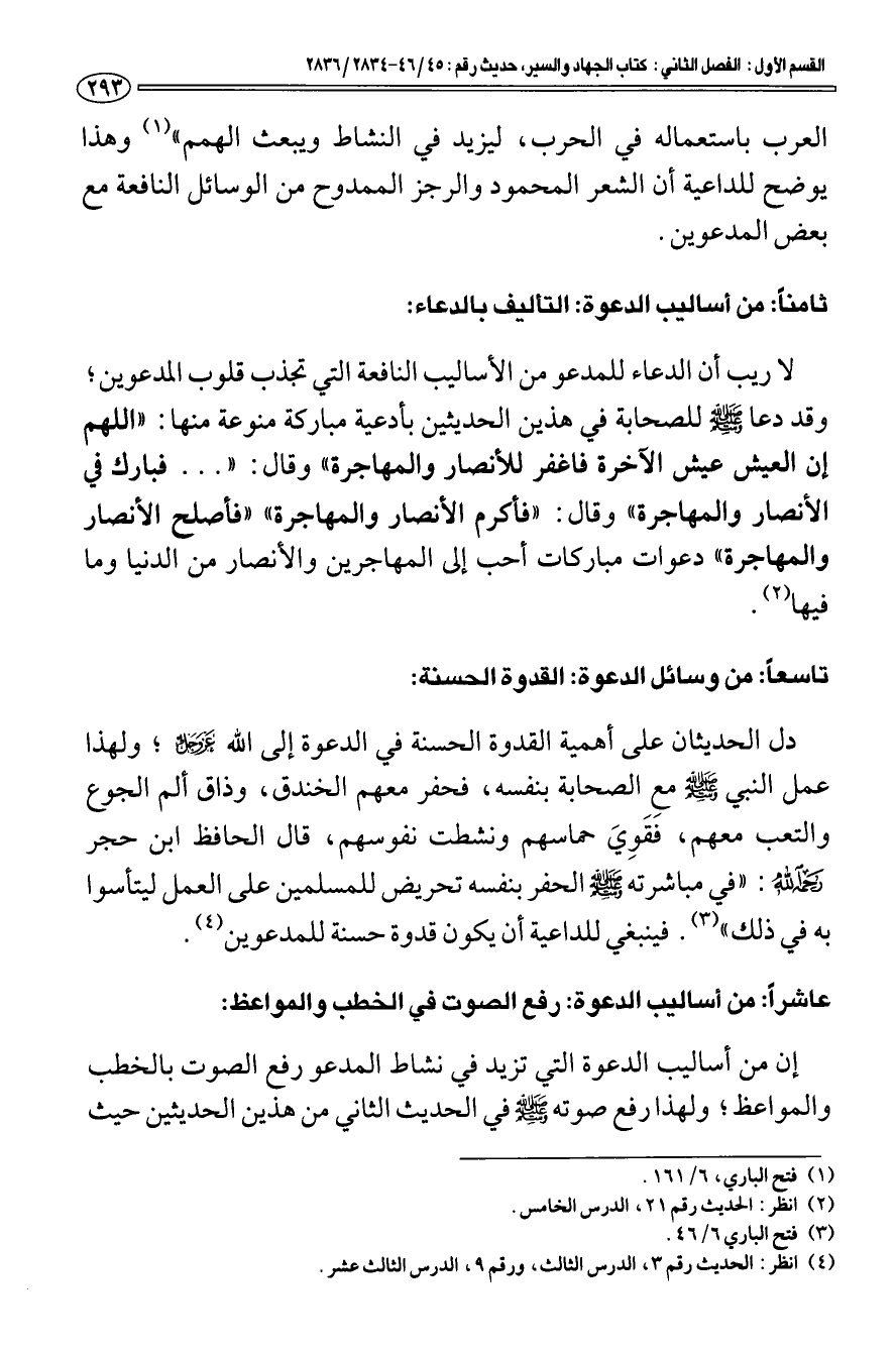ثامنا: من أساليب الدعوة: التأليف بالدعاء: لا ريب أن الدعاء للمدعو من الأساليب النافعة التي تجذب قلوب المدعوين؛ وقد دعا صلى الله عليه وسلم للصحابة في هذين الحديثين بأدعية مباركة منوعة منها: " اللهم إن العيش عيش الآخرة فاغفر للأنصار والمهاجرة " وقال: ". . . فبارك في الأنصار والمهاجرة " وقال: " فأكرم الأنصار والمهاجرة " " فأصلح الأنصار والمهاجرة " دعوات مباركات أحب إلى المهاجرين والأنصار من الدنيا وما فيها (¬2).