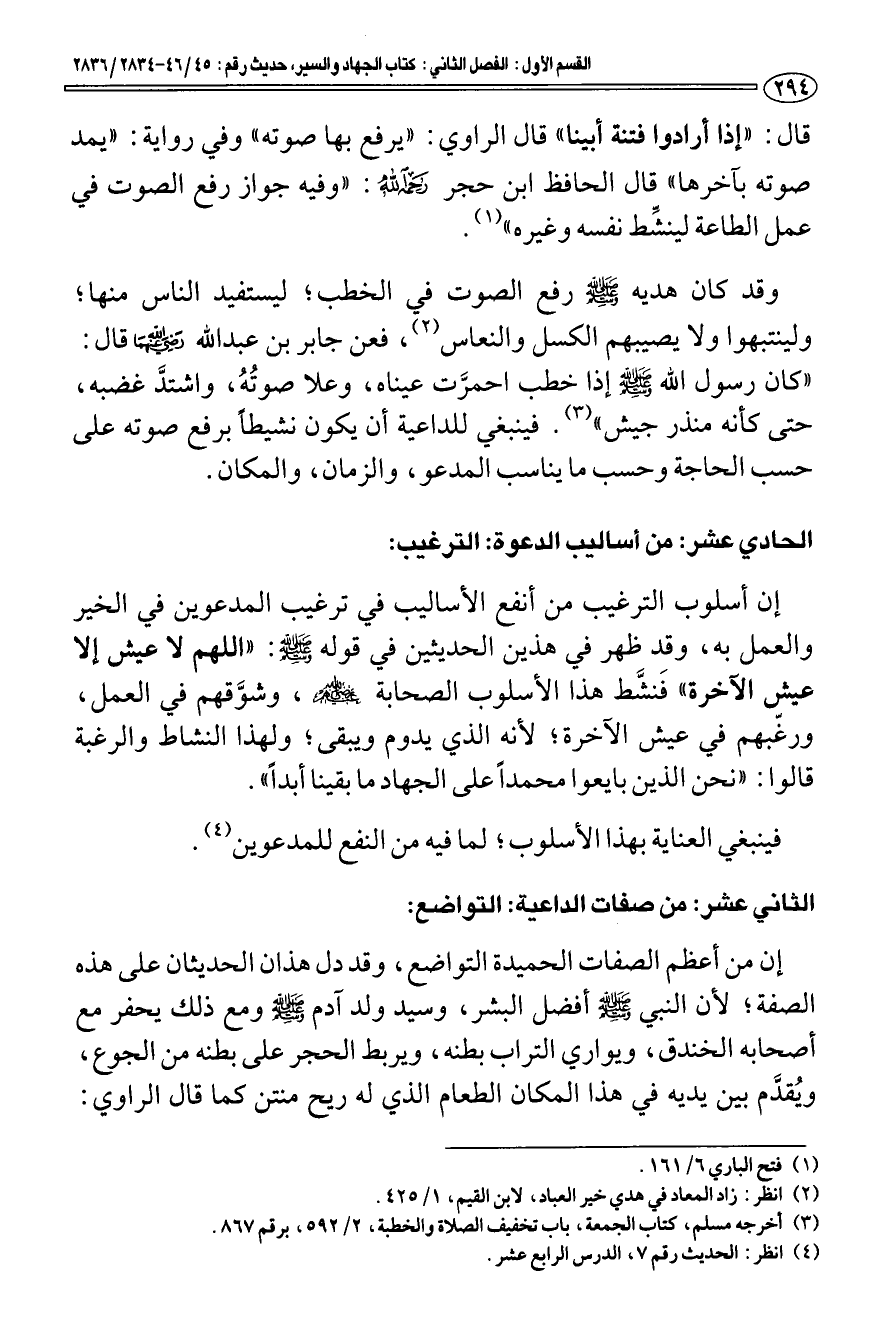 * وقد كان هديه صلى الله عليه وسلم رفع الصوت في الخطب؛ ليستفيد الناس منها؛ ولينتبهوا ولا يصيبهم الكسل والنعاس (¬2) فعن جابر بن عبد الله رضي الله عنه قال: «كان رسول الله صلى الله عليه وسلم إذا خطب احمرَّت عيناه، وعلا صوته، واشتدَّ غضبه، حتى كأنه منذر جيش» (¬3). فينبغي للداعية أن يكون نشيطا برفع صوته على حسب الحاجة وحسب ما يناسب المدعو، والزمان، والمكان.