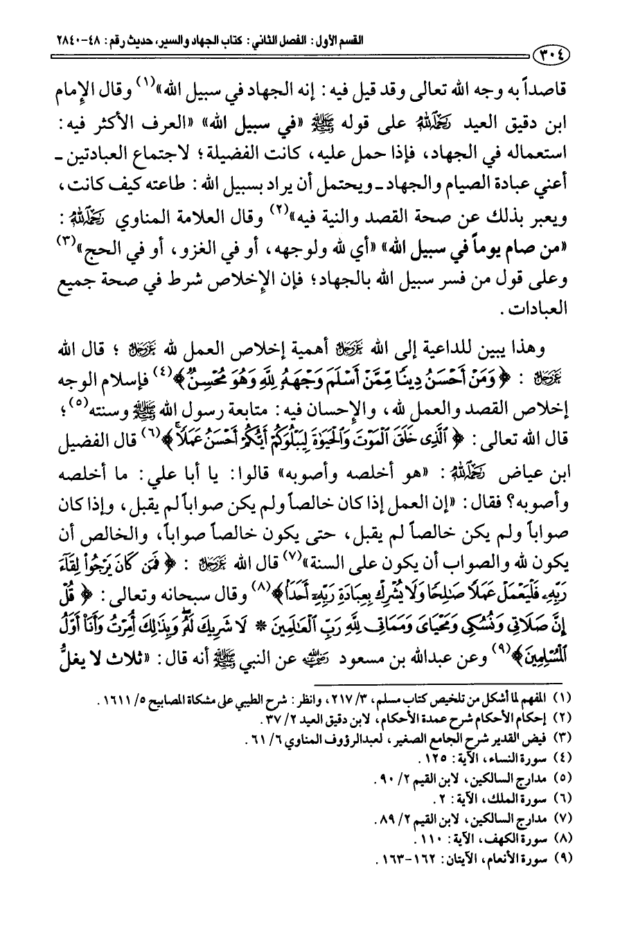 قاصدا به وجه الله تعالى وقد قيل فيه: إنه الجهاد في سبيل الله " (¬1) وقال الإِمام ابن دقيق العيد رحمه الله على قوله صلى الله عليه وسلم " في سبيل الله " " العرف الأكثر فيه: استعماله في الجهاد، فإذا حمل عليه، كانت الفضيلة؛ لاجتماع العبادتين - أعني عبادة الصيام والجهاد - ويحتمل أن يراد بسبيل الله: طاعته كيف كانت، ويعبر بذلك عن صحة القصد والنية فيه " (¬2) وقال العلامة المناوي رحمه الله: «من صام يوما في سبيل الله» أي لله ولوجهه، أو في الغزو، أو في الحج " (¬3) وعلى قول من فسر سبيل الله بالجهاد؛ فإن الإِخلاص شرط في صحة جميع العبادات.