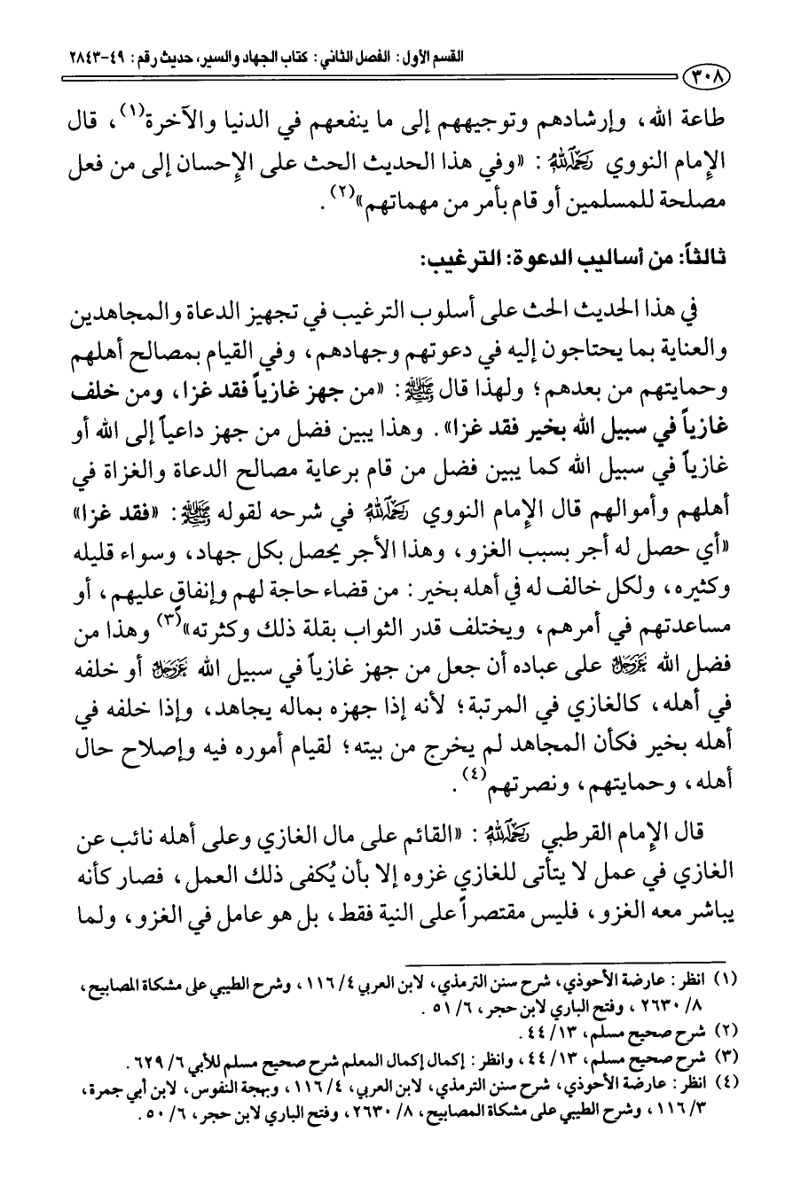 ثالثا: من أساليب الدعوة: الترغيب: في هذا الحديث الحث على أسلوب الترغيب في تجهيز الدعاة والمجاهدين والعناية بما يحتاجون إليه في دعوتهم وجهادهم، وفي القيام بمصالح أهلهم وحمايتهم من بعدهم؛ ولهذا قال صلى الله عليه وسلم: «من جهز غازيا فقد غزا، ومن خلف غازيا في سبيل الله بخير فقد غزا». وهذا يبين فضل من جهز داعيا إلى الله أو غازيا في سبيل الله كما يبين فضل من قام برعاية مصالح الدعاة والغزاة في أهلهم وأموالهم قال الإِمام النووي رحمه الله في شرحه لقوله صلى الله عليه وسلم: " فقد غزا " " أي حصل له أجر بسبب الغزو، وهذا الأجر يحصل بكل جهاد، وسواء قليله وكثيره، ولكل خالف له في أهله بخير: من قضاء حاجة لهم وإنفاقٍ عليهم، أو مساعدتهم في أمرهم، ويختلف قدر الثواب بقلة ذلك وكثرته " (¬3) وهذا من فضل الله عز وجل على عباده أن جعل من جهز غازيا في سبيل الله عز وجل أو خلفه في أهله، كالغازي في المرتبة؛ لأنه إذا جهزه بماله يجاهد، وإذا خلفه في أهله بخير فكأن المجاهد لم يخرج من بيته؛ لقيام أموره فيه وإصلاح حال أهله، وحمايتهم، ونصرتهم (¬4).