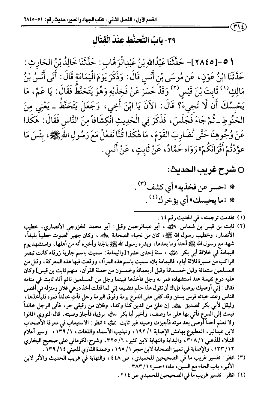 51 - [2845] حَدَّثَنَا عبد الله بْن عَبْدِ الْوَهَّابِ: حَدَّثَنَا خَالِد بْن الحَارِثِ: حَدَّثَنَا ابْن عَوْنٍ، عَن موسَى بْنِ أنس قَالَ: وَذَكَرَ يَوْمَ الْيَمَامَة قَالَ: «أَتَى أنس بن مَالِكٍ (¬1) ثَابِتَ بْنَ قَيْسٍ (¬2) وَقَدْ حَسَرَ عَنْ فَخِذَيْه وَهوَ يَتَحَنَّط فَقَالَ: يَا عَمِّ، مَا يَحْبسكَ أَن لَّا تَجيءَ؟ قَالَ: الآن يَا ابْنَ أَخِي، وَجَعَلَ يَتَحَنَّط - يَعْنِي مِنَ الحنوطِ - ثمَّ جَاءَ فَجَلَسَ، فَذَكَرَ فِي الْحَدِيثِ انْكِشَافا مِنَ النَّاسِ فَقَالَ: هَكَذا عَنْ وجوهِنَا حَتَّى نضَارِبَ القَوْمَ، مَا هكَذا كنَّا نَفعْل مَعَ رَسولِ الله صلى الله عليه وسلم، بِئْسَ مَا عوَّدْتمْ أَقْرَانَكمْ» رَواه حَمَّاد، عَنْ ثَابِتٍ، عَنْ أنس.
