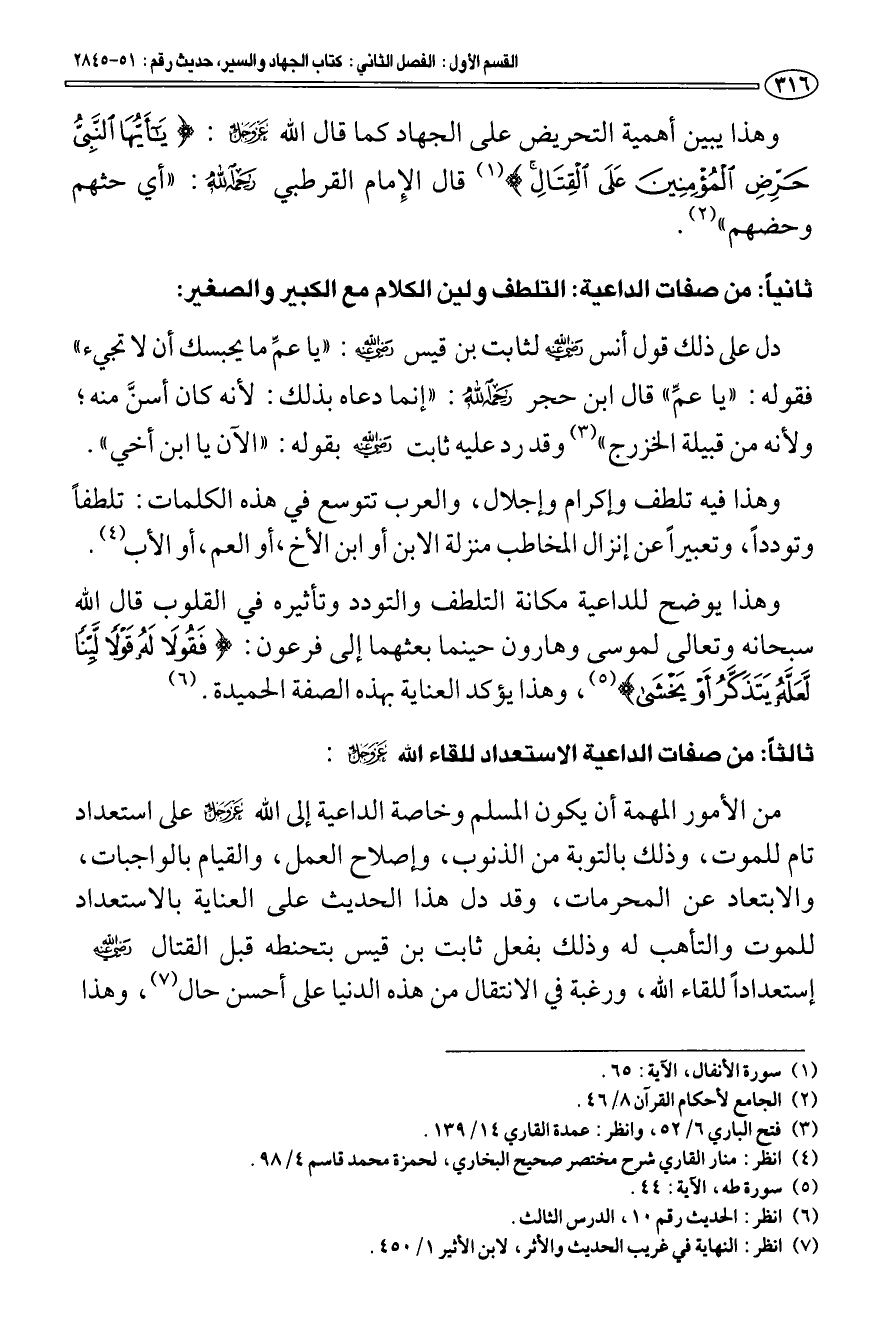 ثانيا: من صفات الداعية: التلطف ولين الكلام مع الكبير والصغير: دل على ذلك قول أنس رضي الله عنه لثابت بن قيس رضي الله عنه: «يا عمِّ ما يحبسك أن لا تجيء» فقوله: " يا عمِّ " قال ابن حجر رحمه الله: " إنما دعاه بذلك: لأنه كان أسنَّ منه؛ ولأنه من قبيلة الخزرج " (¬3) وقد رد عليه ثابت رضي الله عنه بقوله: «الآن يا ابن أخي».