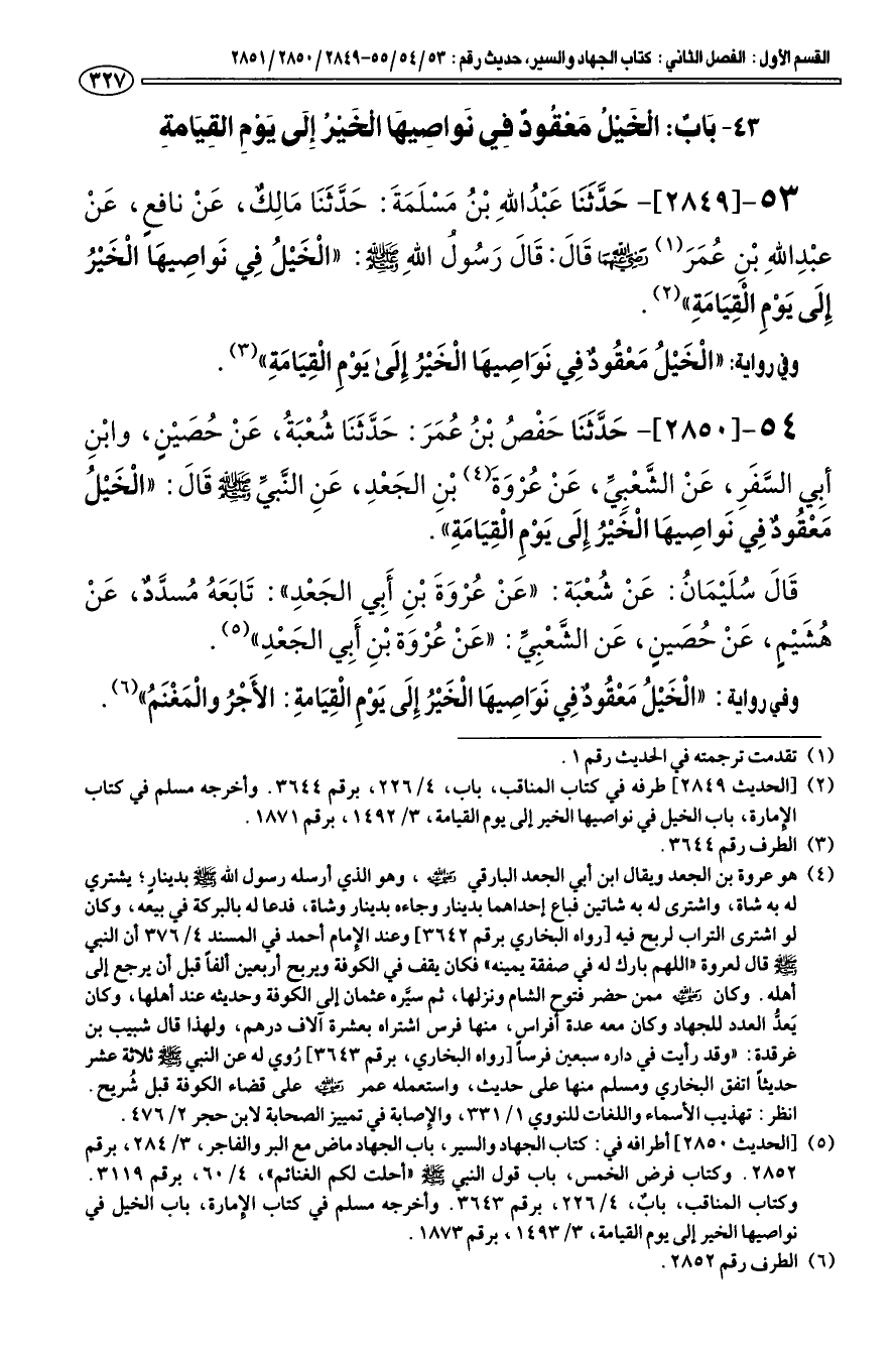 54 - [2850] حَدَّثَنَا حَفْص بْن عمَرَ: حَدَّثَنَا شعْبَة، عَنْ حصَيْنٍ، وابْنِ أبِي السَّفَرِ، عَنْ الشَّعْبِي، عَنْ عرْوَة (¬4) بْنِ الجَعْدِ، عَنِ النَّبي صلى الله عليه وسلم قَالَ: «الْخَيْل مَعْقود فِي نَواصِيهَا الْخَيْر إِلَى يَوْمِ الْقِيَامَة».