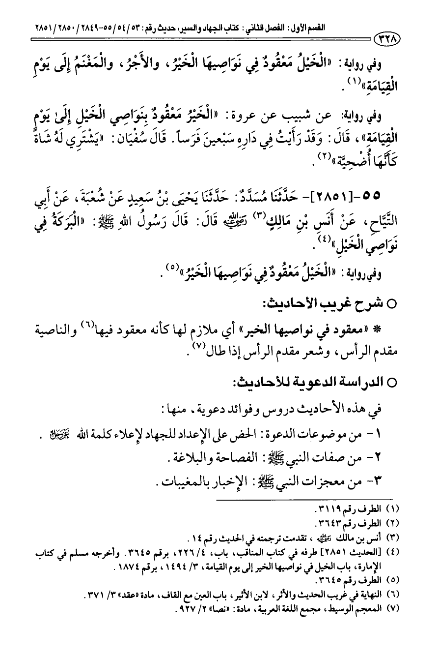 55 - [2851] حَدَّثَنَا مسَدَّد: حَدَّثَنَا يَحْيَى بْن سَعِيدٍ عَنْ شعْبَة، عَنْ أَبِي التَّيَّاحِ، عَنْ أَنَس بْنِ مَالِكٍ (¬3) رضي الله عنه قَالَ: قَالَ رَسول الله صلى الله عليه وسلم: «الْبَرَكَة فِي نَوَاصِي الْخَيْلِ» (¬4).