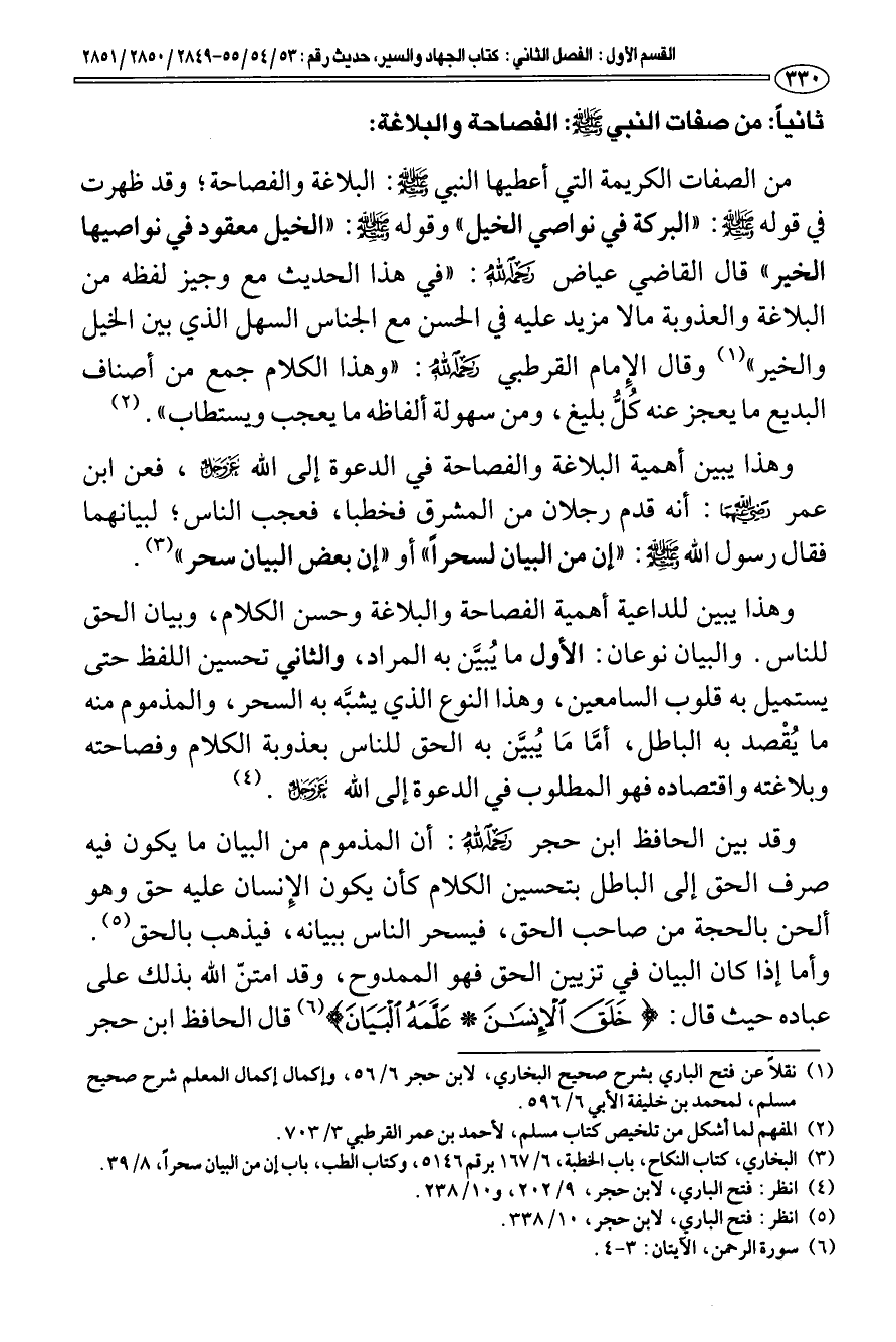 (¬3) البخاري، كتاب النكاح، باب الخطبة، 6/ 167 برقم 5146، وكتاب الطب، باب إن من البيان سحرا، 8/ 39.