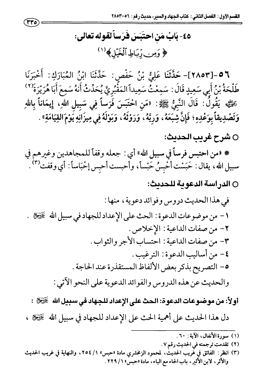* شرح غريب الحديث: * «من احتبس فرسا في سبيل الله» أي: جعله وقفا للمجاهدين وغيرهم في سبيل الله، يقال: حَبَسْت أحْبِس حَبْسا، وأحبست أحبِس إحْبَاسا: أي وقفت (¬3).