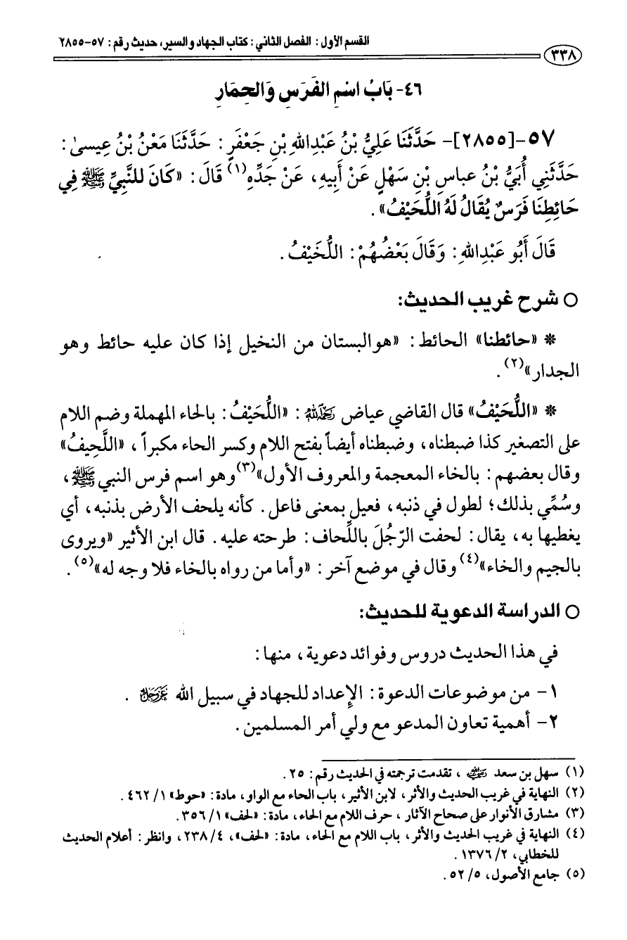 57 - [2855] حَدَّثَنَا عَلِي بْن عبد الله بْنِ جَعْفَر: حَدَّثَنَا مَعْن بن عِيسى: حَدَّثَنِي أبَي بْن عباسِ بْنِ سَهْل عَنْ أَبِيه، عَنْ جَدِّه (¬1) قَالَ: «كَانَ للنَّبِي صلى الله عليه وسلم في حَائِطِنَا فَرَس يقَال لَه اللحَيْف».