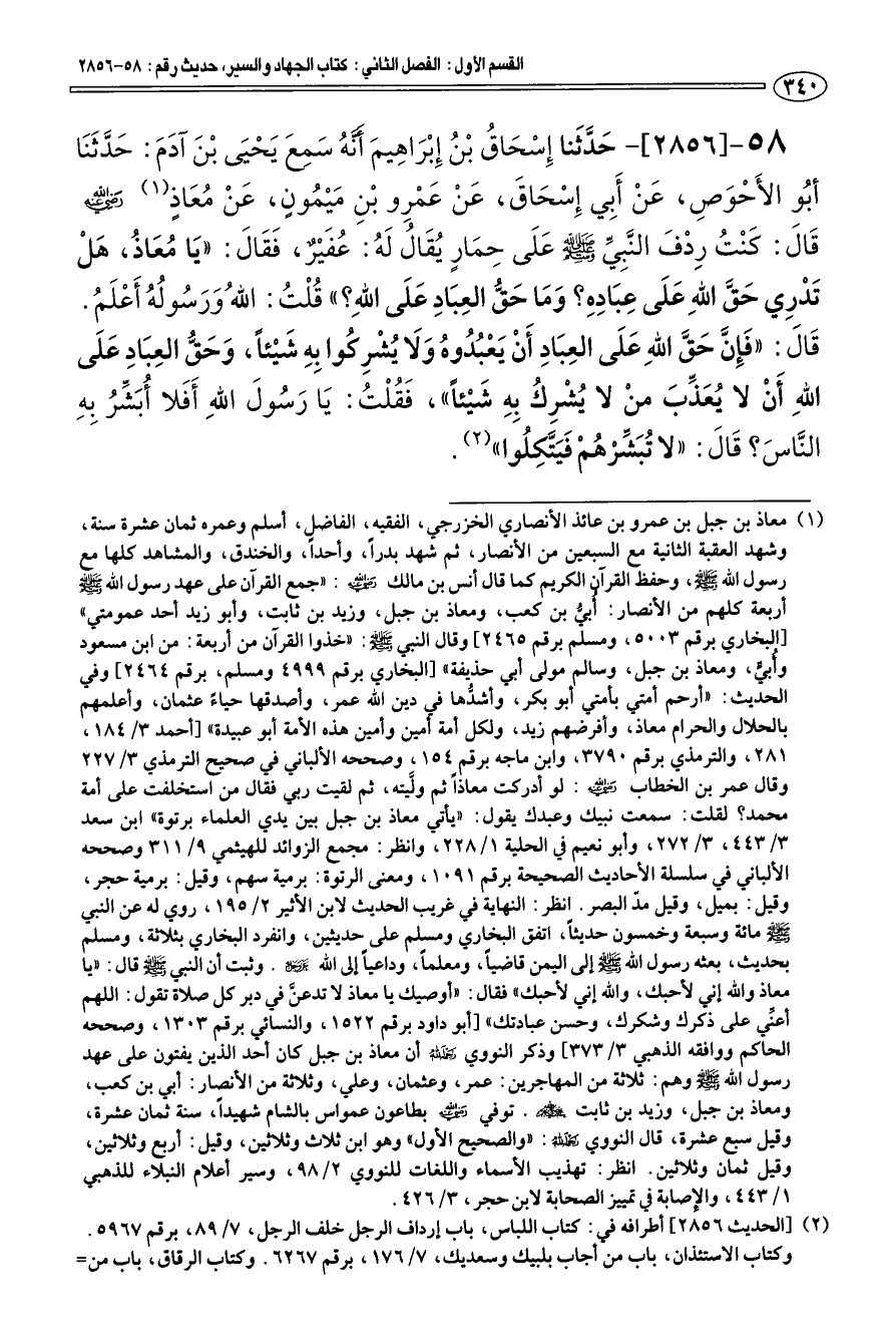 58 - [2856] حَدَّثَنا إِسْحَاق بْن إِبْرَاهِيمَ أنه سَمِعَ يَحْيَى بْنَ آدَمَ: حَدَّثَنَا أبو الأَحْوَصِ، عَن أَبي إِسْحَاقَ، عَنْ عَمْرِو بْنِ مَيْمونٍ، عَنْ معَاذٍ (¬1) رضي الله عنه قَالَ: «كَنْت رِدْفَ النَّبِي صلى الله عليه وسلم عَلَى حِمَارٍ يقَال لَه: عفَيْر، فَقَالَ: " يَا معَاذ، هَلْ تَدْرِي حَقَّ الله عَلَى عِبَادِه؟ وَمَا حَقّ العِبَادِ عَلَى الله؟ " قلْت: الله وَرَسوله أَعْلَم. قَالَ: " فَإِنَّ حَقَّ الله عَلَى العِبَادِ أَنْ يَعْبدوه وَلَا يشْرِكوا بِه شَيْئا، وَحَقّ العِبَادِ عَلَى الله أَنْ لا يعَذِّبَ منْ لا يشْرِك بِه شَيْئا "، فَقلْت: يَا رَسولَ الله أَفَلا أبَشِّر بِه النَّاسَ؟ قَالَ: " لا تبَشِّرْهمْ فَيَتَّكِلوا» (¬2).