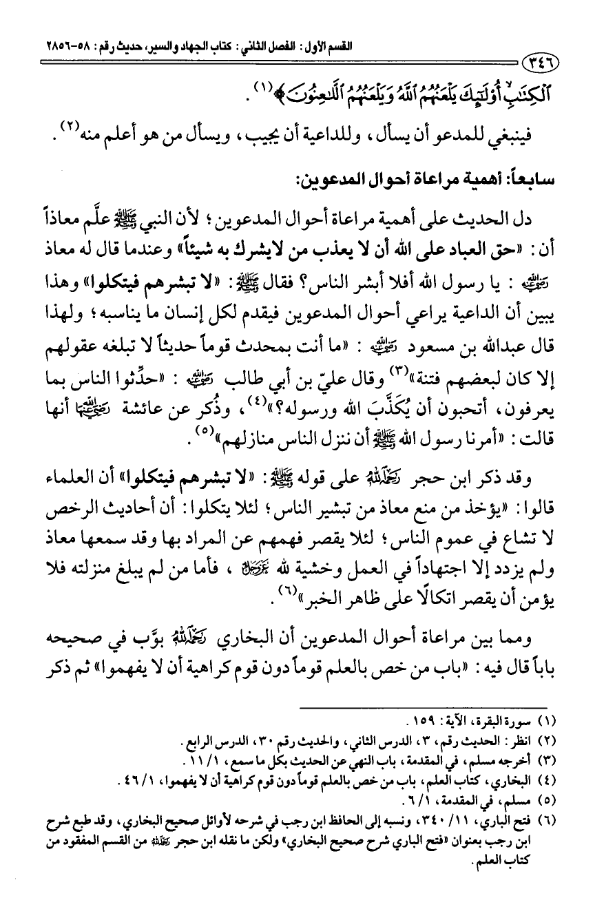 (¬5) فتح الباري، 11/ 340، ونسبه إلى الحافظ ابن رجب في شرحه لأوائل صحيح البخاري، وقد طبع شرح ابن رجب بعنوان " فتح الباري شرح صحيح البخاري " ولكن ما نقله ابن حجر رحمه الله من القسم المفقود من كتاب العلم.