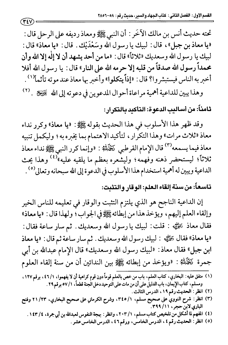 ثامنا: من أساليب الدعوة: التأكيد بالتكرار: وقد ظهر هذا الأسلوب في هذا الحديث بقوله صلى الله عليه وسلم: " يا معاذ " وكرر نداء معاذ " ثلاث مرات " وهذا التكرار، لتأكيد الاهتمام بما يخبره به؛ وليكمل تنبيه معاذ فيما يسمعه (¬3) قال الإِمام القرطبي رحمه الله: " وإنما كرر النبي صلى الله عليه وسلم نداء معاذ ثلاثا؛ ليستحضر ذهنه وفهمه؛ وليشعره بعظم ما يلقيه عليه " (¬4) وهذا يحث الداعية ويبين له أهمية استخدام هذا الأسلوب في الدعوة إلى الله سبحانه وتعالى (¬5).