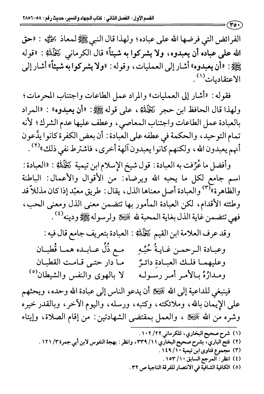 الفرائض التي فرضها الله على عباده؛ ولهذا قال النبي صلى الله عليه وسلم لمعاذ رضي الله عنه: «حق الله على عباده أن يعبدوه، ولا يشركوا به شيئا» قال الكرماني رحمه الله: قوله صلى الله عليه وسلم: «أن يعبدوه» أشار إلى العمليات، وقوله: «ولا يشركوا به شيئا» أشار إلى الاعتقاديات (¬1).