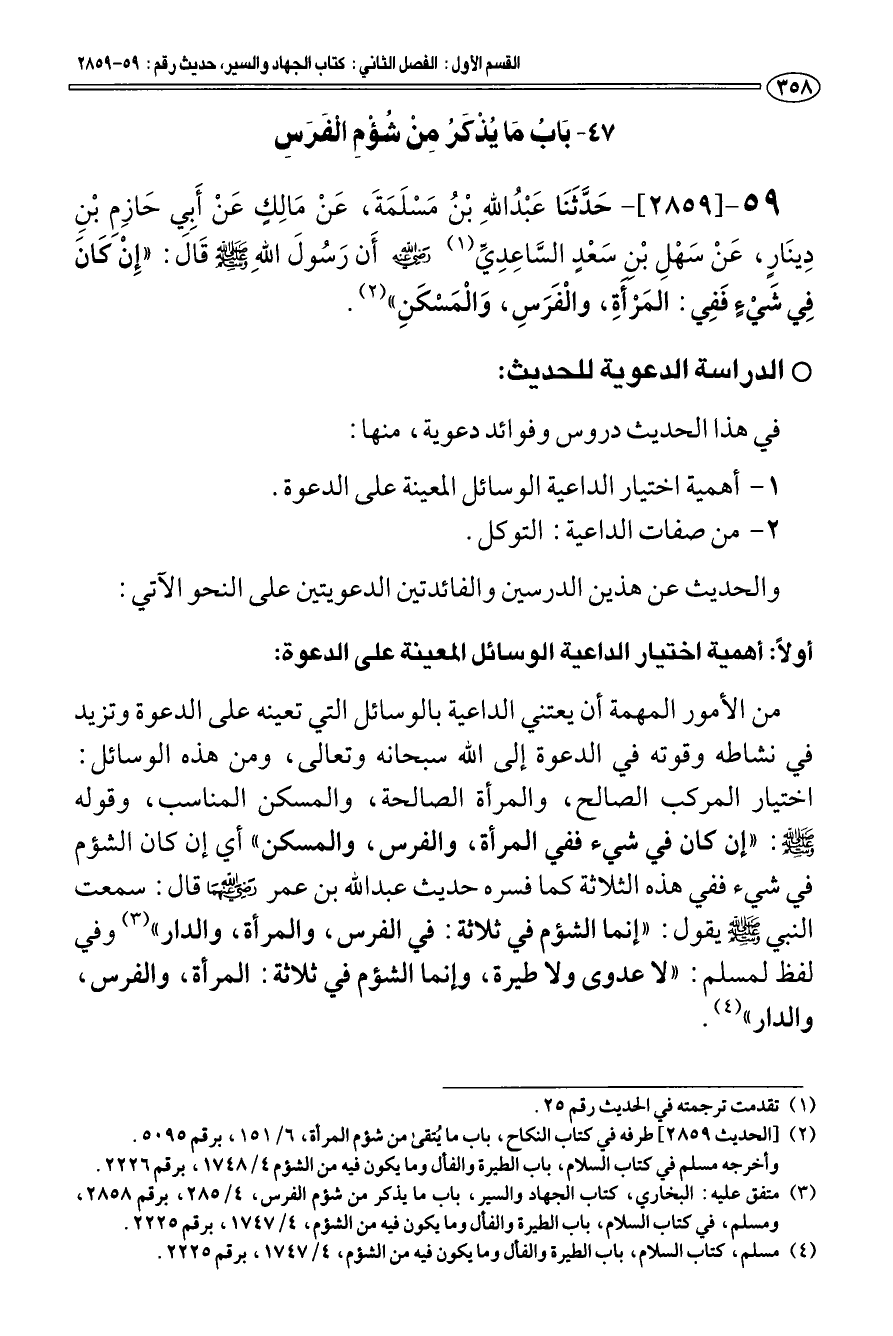 أولا: أهمية اختيار الداعية الوسائل المعينة على الدعوة: من الأمور المهمة أن يعتني الداعية بالوسائل التي تعينه على الدعوة وتزيد في نشاطه وقوته في الدعوة إلى الله سبحانه وتعالى، ومن هذه الوسائل: اختيار المركب الصالح، والمرأة الصالحة، والمسكن المناسب، وقوله صلى الله عليه وسلم: «إن كان في شيء ففي المرأة، والفرس، والمسكن» أي إن كان الشؤم في شيء ففي هذه الثلاثة كما فسره حديث عبد الله بن عمر رضي الله عنهما قال: سمعت النبي صلى الله عليه وسلم يقول: «إنما الشؤم في ثلاثة: في الفرس، والمرأة، والدار» (¬3) وفي لفظ لمسلم: «لا عدوى ولا طيرة، وإنما الشؤم في ثلاثة: المرأة، والفرس، والدار» (¬4).
