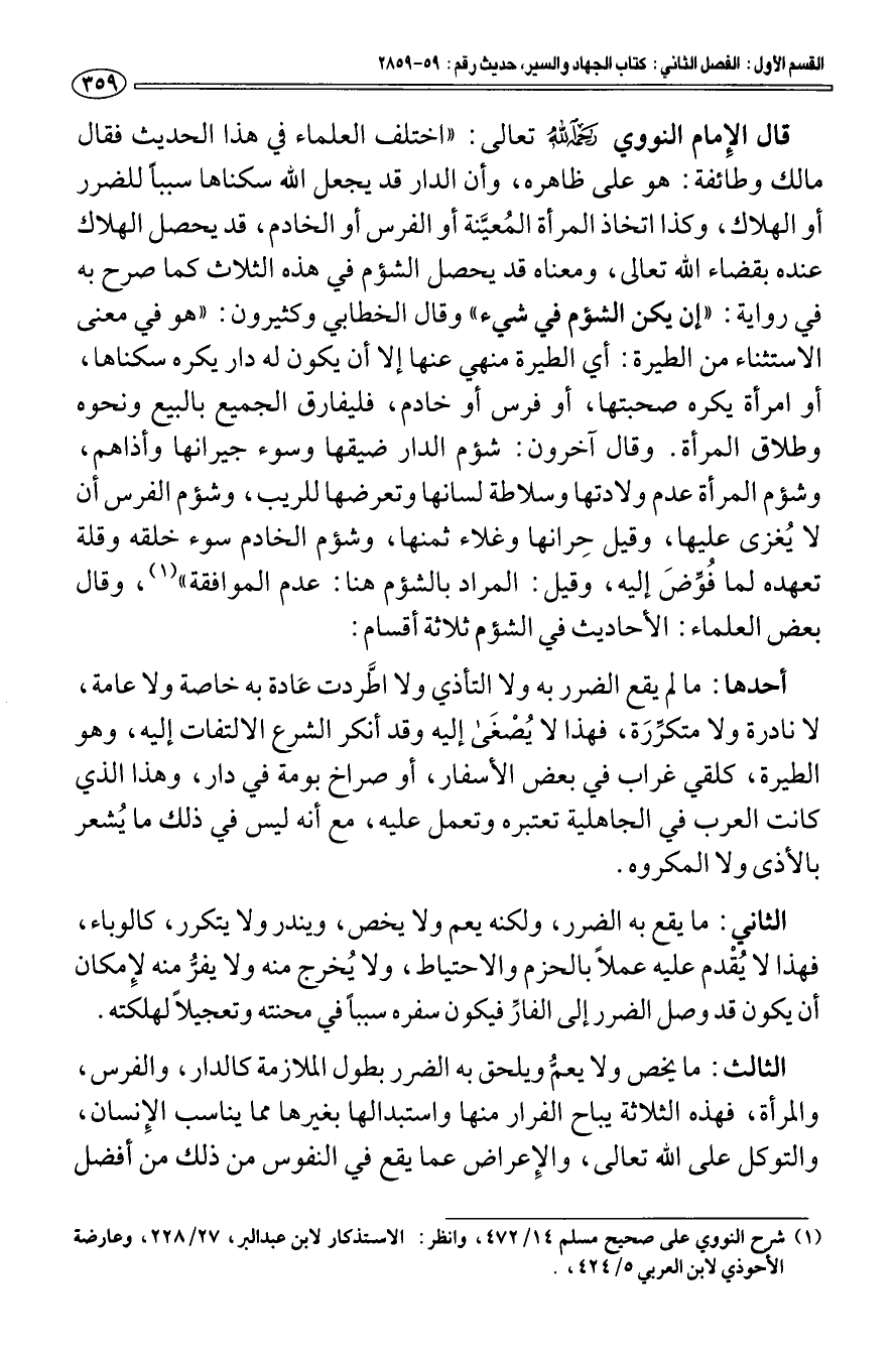 قال الإِمام النووي رحمه الله تعالى: اختلف العلماء في هذا الحديث فقال مالك وطائفة: هو على ظاهره، وأن الدار قد يجعل الله سكناها سبباَ للضرر أو الهلاك، وكذا اتخاذ المرأة المعيَّنة أو الفرس أو الخادم، قد يحصل الهلاك عنده بقضاء الله تعالى، ومعناه قد يحصل الشؤم في هذه الثلاث كما صرح به في رواية: " إن يكن الشؤم في شيء " وقال الخطابي وكثيرون: " هو في معنى الاستثناء من الطيرة: أي الطيرة منهي عنها إلا أن يكون له دار يكره سكناها، أو امرأة يكره صحبتها، أو فرس أو خادم، فليفارق الجميع بالبيع ونحوه وطلاق المرأة. وقال آخرون: شؤم الدار ضيقها وسوء جيرانها وأذاهم، وشؤم المرأة عدم ولادتها وسلاطة لسانها وتعرضها للريب، وشؤم الفرس أن لا يغزى عليها، وقيل حِرانها وغلاء ثمنها، وشؤم الخادم سوء خلقه وقلة تعهده لما فوِّضَ إليه، وقيل: المراد بالشؤم هنا: عدم الموافقة " (¬1) وقال بعض العلماء: الأحاديث في الشؤم ثلاثة أقسام:
