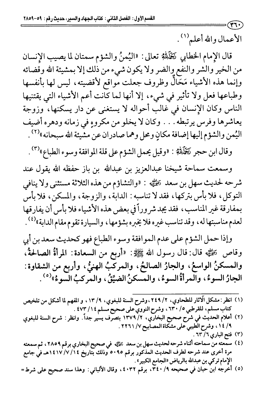وإذا حمل الشؤم على عدم الموافقة وسوء الطباع فهو كحديث سعد بن أبي وقاص رضي الله عنه قال: قال رسول الله صلى الله عليه وسلم: «أربع من السعادة: المرأة الصالحة، والمسكن الواسع، والجار الصالح، والمركب الهنيء، وأربع من الشقاوة: الجار السوء، والمرأة السوء، والمسكن الضيِّق، والمركب السوء» (¬5).