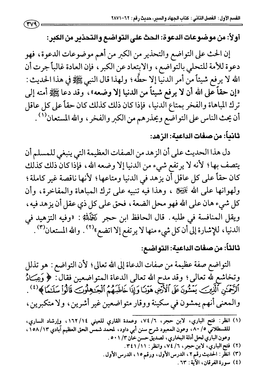ثالثا: من صفات الداعية: التواضع: التواضع صفة عظيمة من صفات الدعاة إلى الله تعالى؛ لأن التواضع: هو تذلل وتخاشع لله تعالى؛ وقد مدِح الله تعالى الدعاة المتواضعين فقال: {وَعِبَادُ الرَّحْمَنِ الَّذِينَ يَمْشُونَ عَلَى الْأَرْضِ هَوْنًا وَإِذَا خَاطَبَهُمُ الْجَاهِلُونَ قَالُوا سَلَامًا} [الفرقان: 63] (¬4) والمعنى أنهم يمشون في سكينة ووقار متواضعين غير أشرين، ولا متكبرين،