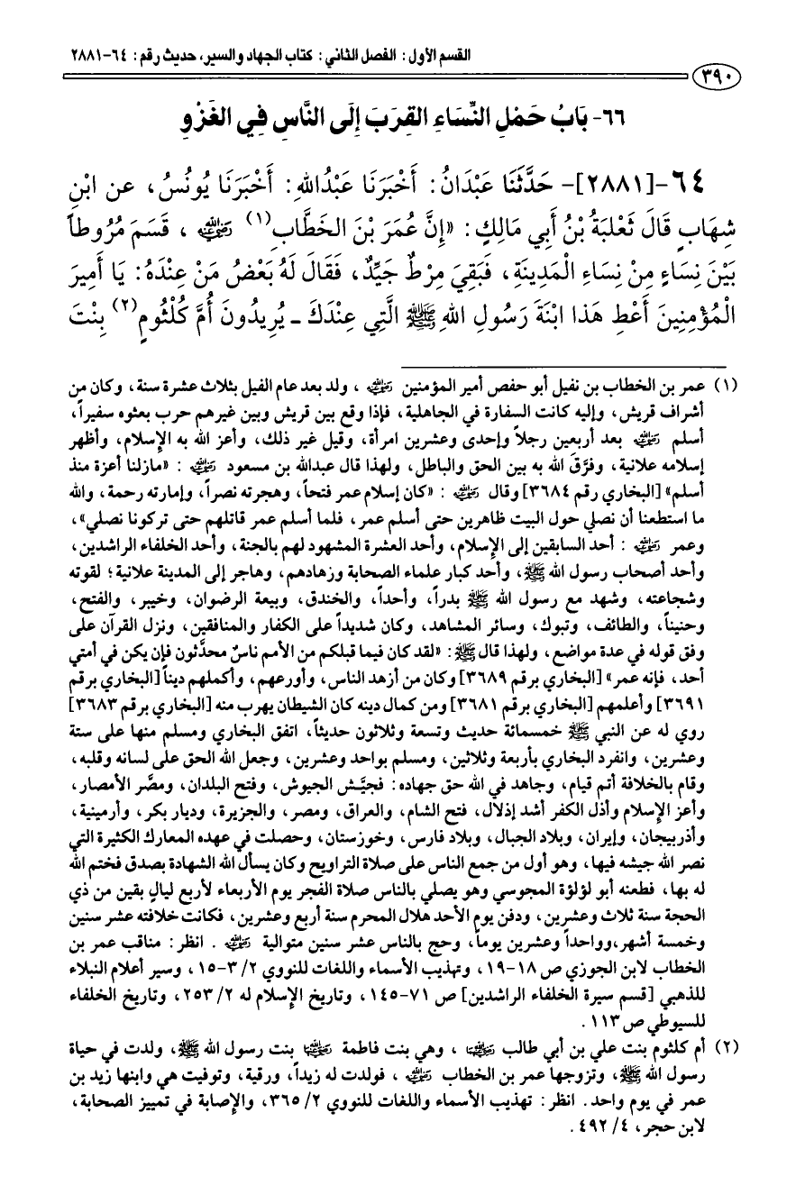 64 - [2881] حَدَّثَنَا عَبْدَان: أَخْبَرَنَا عبد الله: أَخْبَرَنَا يونس، عن ابْنِ شِهَابٍ قَالَ ثَعْلبَة بْن أَبِي مَالِكٍ: " إِنَّ عمَرَ بْنَ الخَطَّابِ (¬1) رضي الله عنه، قَسَمَ مروطا بَينَ نِساءٍ مِنْ نِسَاءِ الْمَدِينَة، فَبَقِيَ مِرْط جَيِّد، فَقَالَ لَه بَعْض مَنْ عِنْدَه: يَا أَمِيرَ الْمؤمِنِينَ أَعْطِ هَذا ابْنَةَ رَسولِ اللهِ صلى الله عليه وسلم الَّتِي عِنْدَكَ- يرِيدونَ أمَّ كلْثومٍ (¬2) بِنْتَ