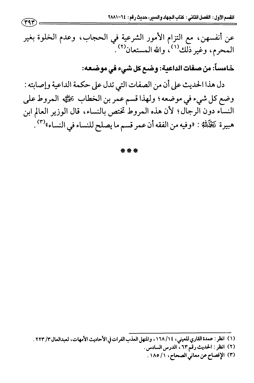 خامسا: من صفات الداعية: وضع كل شيء في موضعه: دل هذا الحديث على أن من الصفات التي تدل على حكمة الداعية وإصابته: وضع كل شيء في موضعه؛ ولهذا قسم عمر بن الخطاب رضي الله عنه المروط على النساء دون الرجال؛ لأن هذه المروط تختص بالنساء، قال الوزير العالم ابن هبيرة رحمه الله: " وفيه من الفقه أن عمر قسم ما يصلح للنساء في النساء " (¬3).