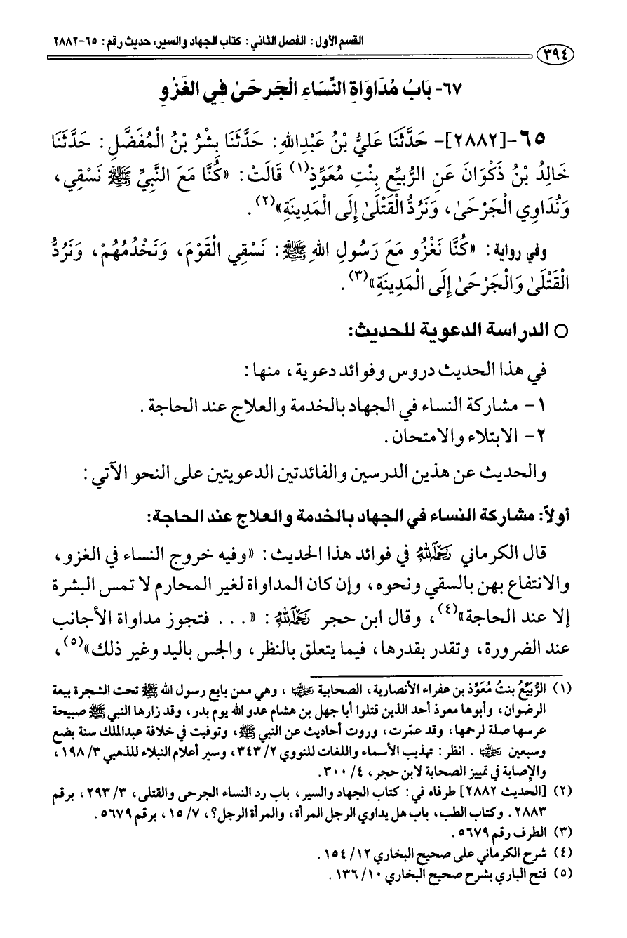(¬2) [الحديث 2882] طرفاه في: كتاب الجهاد والسير، باب رد النساء الجرحى والقتلى، 3/ 293، برقم 2883. وكتاب الطب، باب هل يداوي الرجل المرأة، والمرأة الرجل؟، 7/ 15، برقم 5679.